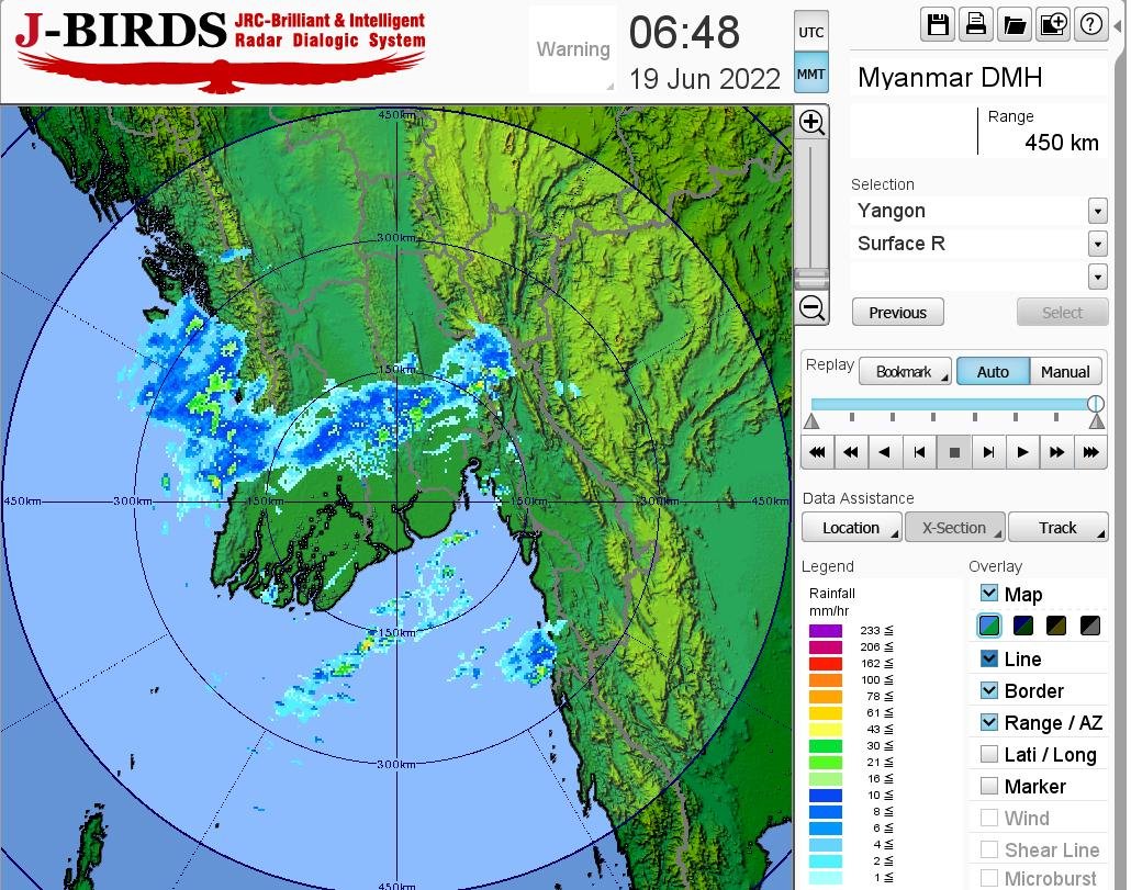 ယနေ့ညနေအထိ ခန့်မှန်းချက်။ စစ်ကိုင်းတိုင်းဒေသကြီးအောက်ပိုင်းနှင့် တနင်္သာရီတိုင်းဒေသကြီးတို့တွင် နေရာကျဲကျဲ၊ မကွေးတိုင်းဒေသကြီး၊ ပဲခူးတိုင်းဒေသကြီး၊ ရန်ကုန်တိုင်းဒေသကြီး၊ ရှမ်းပြည်နယ်(မြောက်ပိုင်း၊ အရှေ့ပိုင်း)၊ ကယားပြည်နယ်နှင့် ကရင်ပြည်နယ်တို့တွင် နေရာစိပ်စိပ်နှင့် ကျန်တိုင်းဒေသကြီးနှင့် ပြည်နယ်တို့တွင် နေရာအနှံ့အပြားမိုးထစ်ချုန်းရွာပြီး၊ နေပြည်တော်တွင် ဒေသအလိုက်နှင့် စစ်ကိုင်းတိုင်းဒေသကြီး အထက်ပိုင်း၊ မန္တလေးတိုင်းဒေသကြီး၊ ကချင်ပြည်နယ်နှင့် ရခိုင်ပြည်နယ်တို့တွင် နေရာကွက်၍ မိုးကြီးနိုင်ပါသည်။ ရွာရန်ရာနှုန်းပြည့်ဖြစ်ပါသည်။