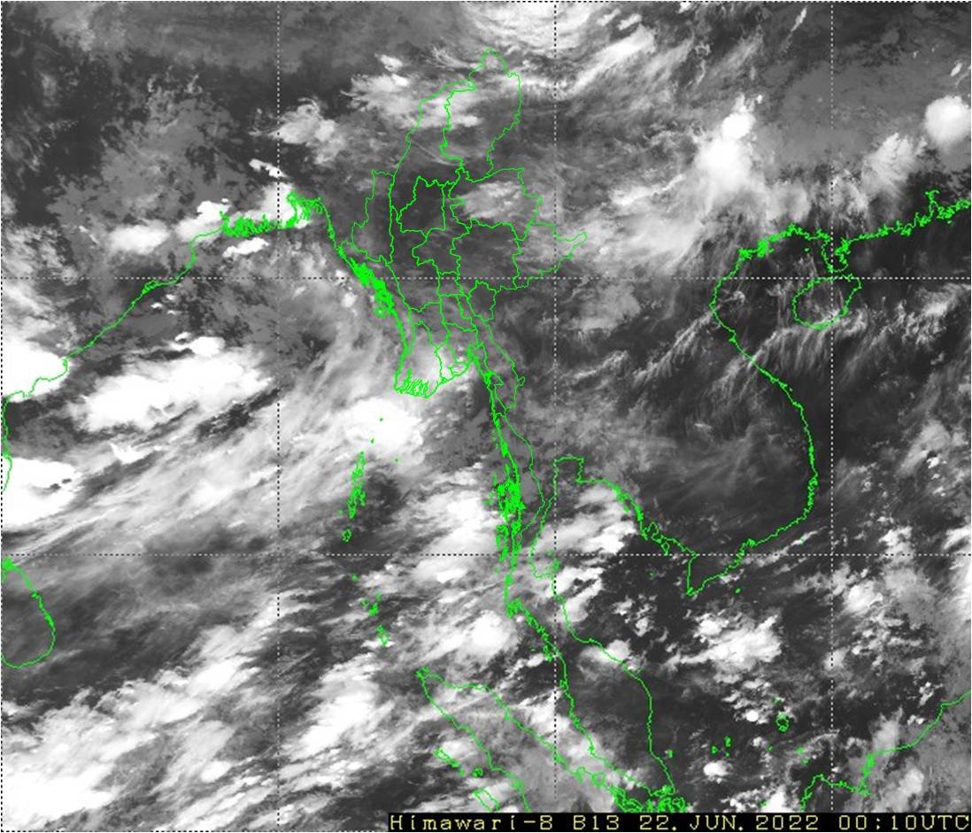 ယနေ့ညနေအထိခန့်မှန်းချက်။ စစ်ကိုင်းတိုင်းဒေသကြီးအောက်ပိုင်းနှင့် မကွေးတိုင်းဒေသကြီးတို့တွင်နေရာကွက်ကျား၊စစ်ကိုင်းတိုင်းဒေသကြီးအထက်ပိုင်း၊ မန္တလေးတိုင်းဒေသကြီးနှင့်ရှမ်းပြည်နယ်(မြောက်ပိုင်း)တို့တွင် နေရာကျဲကျဲ၊ ပဲခူးတိုင်းဒေသကြီး၊ ရှမ်းပြည်နယ်(တောင်ပိုင်း)၊ချင်းပြည်နယ်နှင့် ကယားပြည်နယ်တို့တွင် နေရာစိပ်စိပ်နှင့် ကျန်တိုင်းဒေသကြီးနှင့် ပြည်နယ်တို့တွင် နေရာအနှံ့အပြားမိုးထစ်ချုန်းရွာပြီး၊ ရခိုင်ပြည်နယ်တွင် နေရာကွက်၍ မိုးကြီးနိုင်ပါသည်။ ရွာရန်ရာနှုန်းပြည့် ဖြစ်ပါသည်။