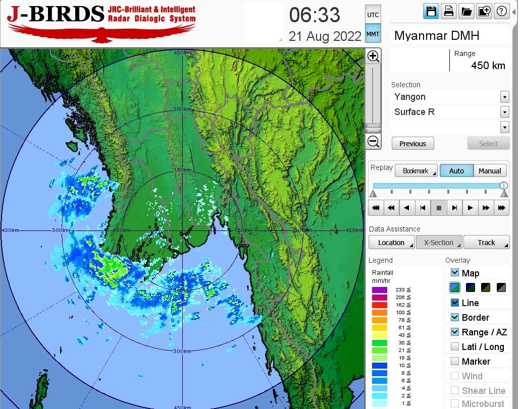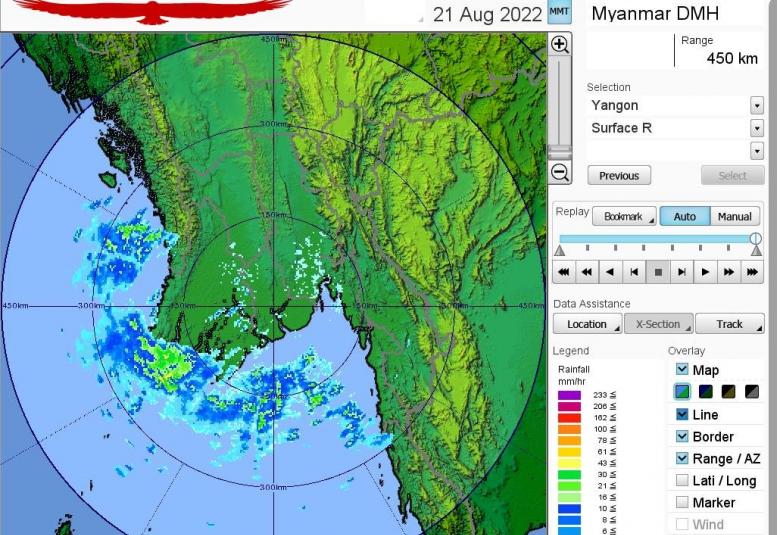 ယနေ့ညနေအထိ ခန့်မှန်းချက်။ စစ်ကိုင်းတိုင်းဒေသကြီး၊ မကွေးတိုင်းဒေသကြီး၊ ကချင်ပြည်နယ်နှင့် ချင်းပြည်နယ်တို့တွင် နေရာကျဲကျဲ၊ နေပြည်တော်နှင့် မန္တလေးတိုင်းဒေသကြီးတို့တွင် နေရာစိပ်စိပ်နှင့် ကျန်တိုင်းဒေသကြီးနှင့် ပြည်နယ်တို့တွင် နေရာအနှံ့အပြားမိုးထစ်ချုန်းရွာပြီး၊ ရန်ကုန်တိုင်းဒေသကြီး၊ ဧရာဝတီတိုင်းဒေသကြီး၊ တနင်္သာရီတိုင်းဒေသကြီး၊ ရှမ်းပြည်နယ်၊ ကရင်ပြည်နယ်နှင့် မွန်ပြည်နယ်တို့တွင် နေရာကွက်၍ မိုးကြီးနိုင်ပါသည်။ ရွာရန်ရာနှုန်းပြည့် ဖြစ်ပါသည်။