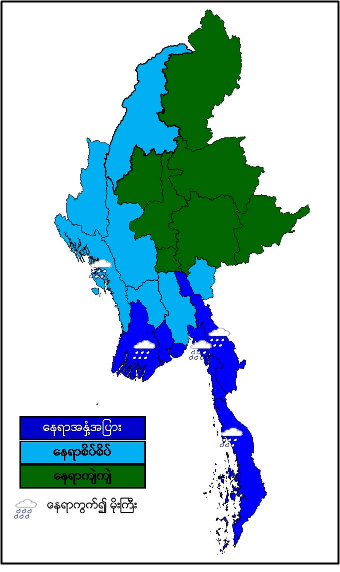 မနက်ဖြန်နံနက်အထိခန့်မှန်းချက်။ နေပြည်တော်၊ စစ်ကိုင်းတိုင်းဒေသကြီးအောက်ပိုင်း၊ မန္တလေးတိုင်းဒေသကြီး၊ ကချင်ပြည်နယ်နှင့် ရှမ်းပြည်နယ်တို့တွင်နေရာကျဲကျဲ၊ စစ်ကိုင်းတိုင်းဒေသကြီးအထက်ပိုင်း၊ မကွေးတိုင်းဒေသကြီး၊ ပဲခူးတိုင်းဒေသကြီး၊ ချင်းပြည်နယ်၊ ရခိုင်ပြည်နယ်နှင့် ကယားပြည်နယ်တို့တွင် နေရာစိပ်စိပ်နှင့် ကျန်တိုင်းဒေသကြီးနှင့် ပြည်နယ်တို့တွင် နေရာအနှံ့အပြားမိုးထစ်ချုန်းရွာပြီး၊ ဧရာဝတီတိုင်းဒေသကြီး၊ တနင်္သာရီတိုင်းဒေသကြီး၊ ရခိုင်ပြည်နယ်၊ ကရင်ပြည်နယ်နှင့် မွန်ပြည်နယ်တို့တွင် နေရာကွက်၍ မိုးကြီးနိုင်ပါသည်။ ရွာရန်ရာနှုန်းပြည့် ဖြစ်ပါသည်။