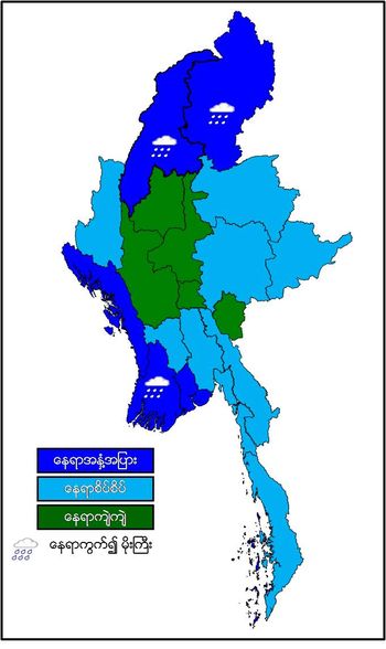 မနက်ဖြန်နံနက်အထိခန့်မှန်းချက်။ နေပြည်တော်၊ စစ်ကိုင်းတိုင်းဒေသကြီးအောက်ပိုင်း၊ မန္တလေးတိုင်းဒေသကြီး၊ မကွေးတိုင်းဒေသကြီးနှင့် ကယားပြည်နယ်တို့တွင် နေရာကျဲကျဲ၊ ပဲခူးတိုင်းဒေသကြီး၊ တနင်္သာရီတိုင်းဒေသကြီး၊ ရှမ်းပြည်နယ်၊ ချင်းပြည်နယ်၊ ကရင်ပြည်နယ်နှင့် မွန်ပြည်နယ်တို့တွင် နေရာစိပ်စိပ်နှင့်ကျန်တိုင်းဒေသကြီးနှင့် ပြည်နယ်တို့တွင် နေရာအနှံ့အပြားမိုးထစ်ချုန်းရွာပြီး၊ စစ်ကိုင်းတိုင်းဒေသကြီးအထက်ပိုင်း၊ ဧရာဝတီတိုင်းဒေသကြီးနှင့် ကချင်ပြည်နယ်တို့တွင် နေရာကွက်၍ မိုးကြီးနိုင်ပါသည်။ ရွာရန်ရာနှုန်းပြည့် ဖြစ်ပါသည်။