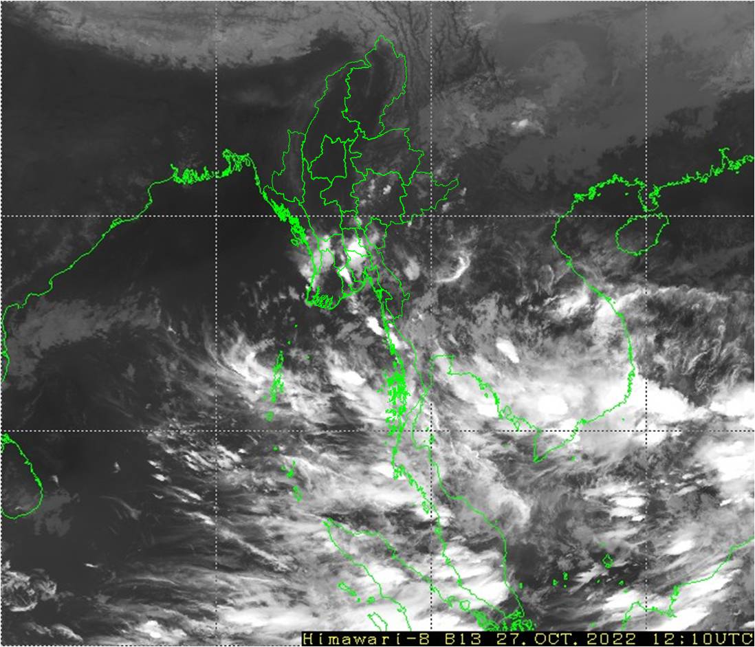 ဘင်္ဂလားပင်လယ်အော် အခြေအနေ။ ကပ္ပလီပင်လယ်ပြင်နှင့် ဘင်္ဂလားပင်လယ်အော် တောင်ပိုင်းတို့တွင် တိမ်အသင့်အတင့်မှ တိမ်ထူထပ်နေပြီး၊ ကျန်ဘင်္ဂလားပင်လယ်အော်တွင် တိမ်အနည်းငယ် ဖြစ်ထွန်းနေပါသည်။