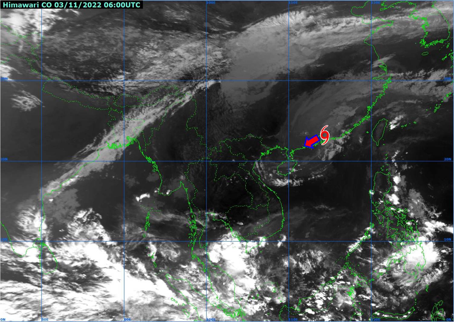 ထူးခြားသည့် အခြေအနေ။ ယနေ့မြန်မာစံတော်ချိန် (၁၂:၃၀)နာရီအချိန် တိုင်းထွာချက်များအရတရုတ်နိုင်ငံ၊ ဂွမ်ဒေါင်း(Guangdong) ကမ်းခြေအနီးတွင်ဖြစ်ပေါ်နေသော အပူပိုင်းမုန်တိုင်းငယ်သည် တရုတ်နိုင်ငံ၊ ဂွမ်ဒေါင်း(Guangdong) ကမ်းခြေကို ဖြတ်ကျော်ဝင်ရောက်ခဲ့ပြီး ဖြစ်ပါသည်။ အဆိုပါ အပူပိုင်းမုန်တိုင်းငယ်သည် အနောက်-အနောက်တောင်ဘက်သို့ ဆက်လက်ရွေ့လျားပြီး တဖြည်းဖြည်း အားလျော့သွားမည်ဟု ခန့်မှန်းရပါသည်။