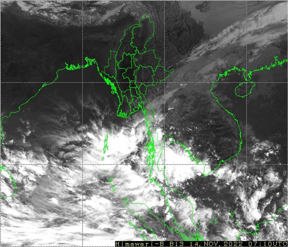 ဘင်္ဂလားပင်လယ်အော်အခြေအနေ။ ကပ္ပလီပင်လယ်ပြင်နှင့် ဘင်္ဂလားပင်လယ်အော်တောင်ပိုင်းတို့တွင် တိမ်ထူထပ်နေပြီး၊ ကျန်ဘင်္ဂလားပင်လယ်အော်တွင်တိမ်အနည်းငယ် ဖြစ်ထွန်းနေပါသည်။