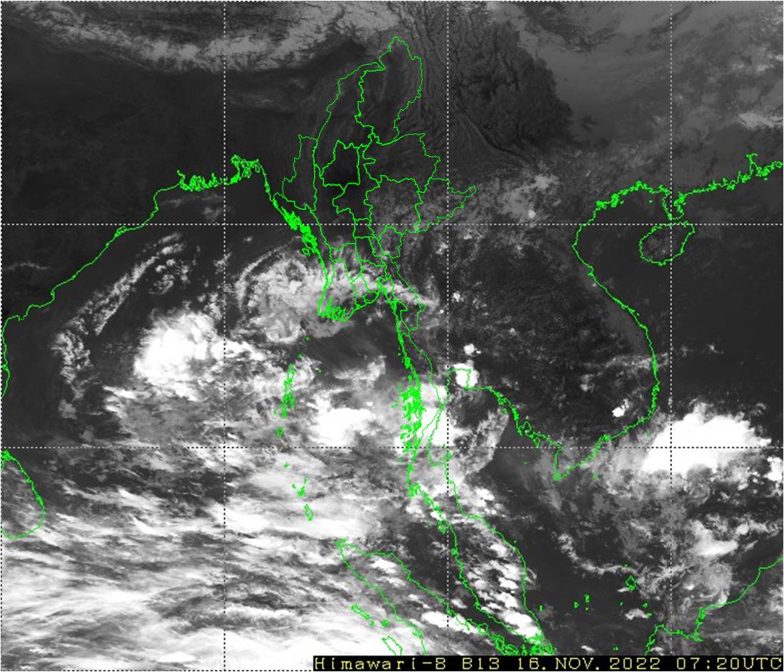 ဘင်္ဂလားပင်လယ်အော်အ‌ခြေအနေ။ ဘင်္ဂလားပင်လယ်အော်မြောက်ပိုင်းတွင် တိမ်အနည်းငယ် ဖြစ်ထွန်းနေပြီး၊ ကပ္ပလီပင်လယ်ပြင်နှင့် ကျန်ဘင်္ဂလားပင်လယ်အော်တို့တွင်တိမ်အသင့်အတင့်မှ တိမ်ထူထပ်နေပါသည်။