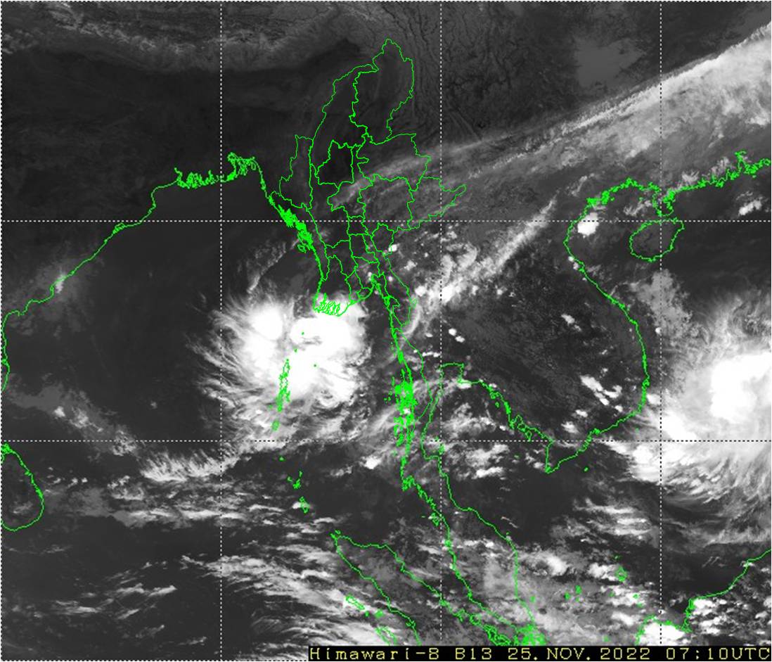 ဘင်္ဂလားပင်လယ်အော်အ‌ခြေအနေ။ ကပ္ပလီပင်လယ်ပြင်၊ ဘင်္ဂလားပင်လယ်အော်အရှေ့အလယ်ပိုင်းနှင့် အရှေ့တောင်ပိုင်းတို့တွင် တိမ်အသင့်အတင့်မှ တိမ်ထူထပ်နေပြီး၊ ကျန်ဘင်္ဂလားပင်လယ်အော်တွင် တိမ်အနည်းငယ် ဖြစ်ထွန်းနေပါသည်။