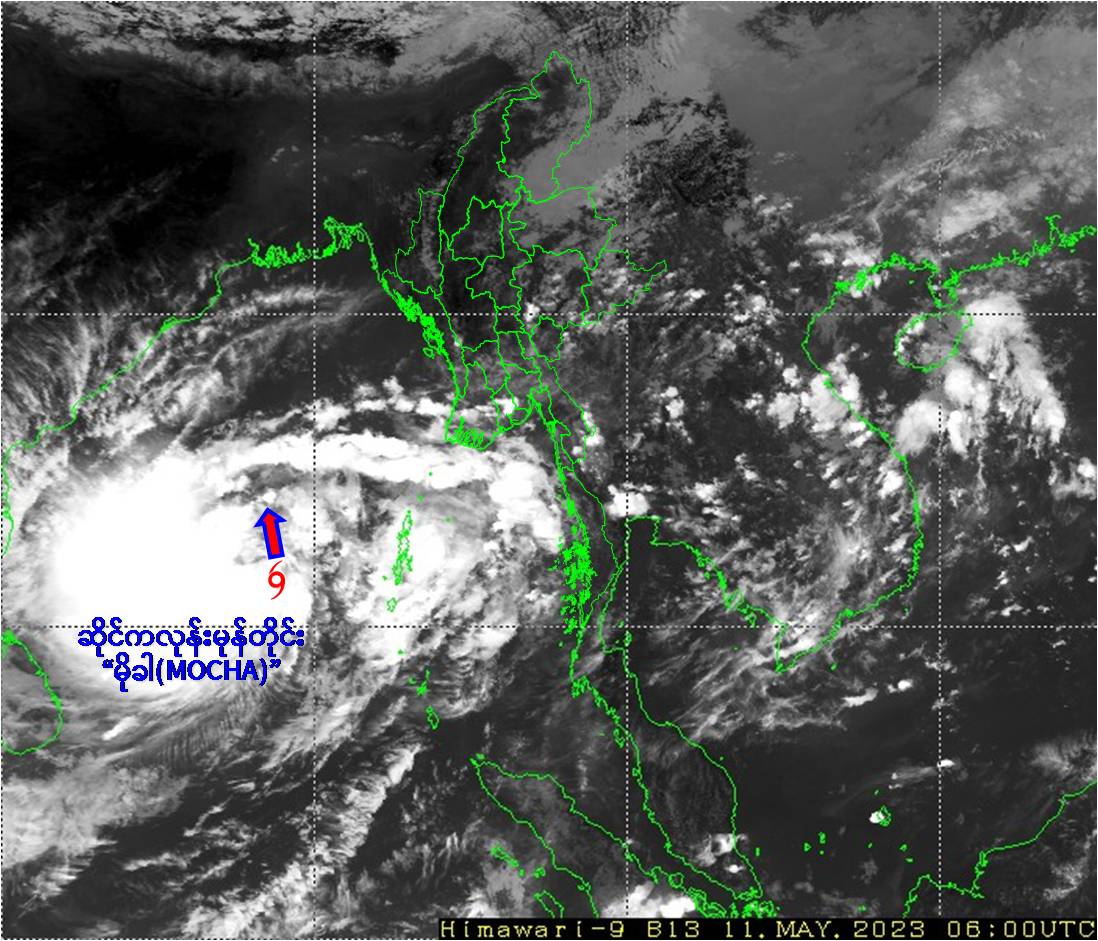 ဘင်္ဂလားပင်လယ်အော်အခြေအနေ။ ယနေ့မြန်မာစံတော်ချိန် (၁၂:၃၀)နာရီအချိန် တိုင်းထွာချက်များအရ ဘင်္ဂလားပင်လယ်အော်အရှေ့တောင်ပိုင်းတွင် ဖြစ်ပေါ်နေသောဆိုင်ကလုန်းမုန်တိုင်း (Cyclonic Storm) “မိုခါ(MOCHA)” သည် မြောက်-အနောက်မြောက်ဘက် သို့ ဆက်လက်ရွေ့လျားခဲ့ပြီး၊ မြန်မာနိုင်ငံ၊ ကိုကိုးကျွန်းမြို့(Coco Island)၏ အနောက်-အနောက်တောင်ဘက် ရေမိုင်(၃၄၅)မိုင်ခန့်၊ ဟိုင်းကြီးကျွန်းမြို့ (Hainggyigyun)၏ အနောက်-အနောက်တောင်ဘက် ရေမိုင်(၄၆၀) မိုင်ခန့်၊ စစ်တွေမြို့(Sittwe)၏ တောင်-အနောက်တောင်ဘက် ရေမိုင်(၅၈၀) မိုင်ခန့်၊ အိန္ဒိယနိုင်ငံ၊ နီကိုးဘားကျွန်း(Nicobar Islands)၏ အနောက်-အနောက်မြောက်ဘက် ရေမိုင်(၄၄၅)မိုင်ခန့်၊ပို့ပလဲယား(Port Blair)၏ အနောက်ဘက် ရေမိုင်(၂၈၅)မိုင်ခန့်နှင့် ဘင်္ဂလားဒေ့ရှ်နိုင်ငံ၊ ကော့ဘဇားမြို့(Cox’s Bazar)၏ တောင်-အနောက်တောင်ဘက် ရေမိုင်(၆၃၀) မိုင်ခန့်အကွာ ပင်လယ်ပြင်ကို ဗဟိုပြုနေပါသည်။ ဘင်္ဂလားပင်လယ်အော်မြောက်ပိုင်းတွင် တိမ်အသင့်အတင့် ဖြစ်ထွန်းနေပြီး၊ ကပ္ပလီပင်လယ်ပြင်နှင့် ကျန်ဘင်္ဂလားပင်လယ်အော်တို့တွင် တိမ်ထူထပ်နေပါသည်။