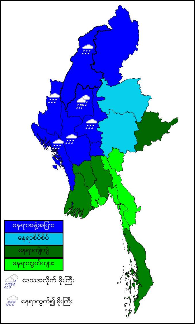 မနက်ဖြန်နံနက်အထိခန့်မှန်းချက်။ နေပြည်တော်၊ စစ်ကိုင်းတိုင်းဒေသကြီး၊ မန္တလေးတိုင်းဒေသကြီး၊ မကွေးတိုင်းဒေသကြီး၊ ကချင်ပြည်နယ်၊ ချင်းပြည်နယ်နှင့် ရခိုင်ပြည်နယ် တို့တွင် နေရာအနှံ့အပြား၊ ရှမ်းပြည်နယ်(မြောက်ပိုင်းနှင့် တောင်ပိုင်း)တွင် နေရာစိပ်စိပ်၊ ပဲခူးတိုင်းဒေသကြီး၊ ဧရာဝတီတိုင်းဒေသကြီး၊ တနင်္သာရီတိုင်းဒေသကြီးနှင့် ရှမ်း ပြည်နယ်(အရှေ့ပိုင်း)တို့တွင် နေရာကျဲကျဲနှင့် ကျန်တိုင်းဒေသကြီးနှင့် ပြည်နယ်တို့တွင် နေရာကွက်ကျား မိုးထစ်ချုန်းရွာပြီး၊ စစ်ကိုင်းတိုင်းဒေသကြီးအောက်ပိုင်းတွင် ဒေသ အလိုက်နှင့် စစ်ကိုင်းတိုင်းဒေသကြီးအထက်ပိုင်း၊ မန္တလေးတိုင်းဒေသကြီး၊ မကွေးတိုင်းဒေသကြီး၊ ချင်းပြည်နယ်နှင့် ရခိုင်ပြည်နယ်တို့တွင် နေရာကွက်၍ မိုးကြီးနိုင်ပါသည်။ ရွာရန်ရာနှုန်း(၈၀) ဖြစ်ပါသည်။