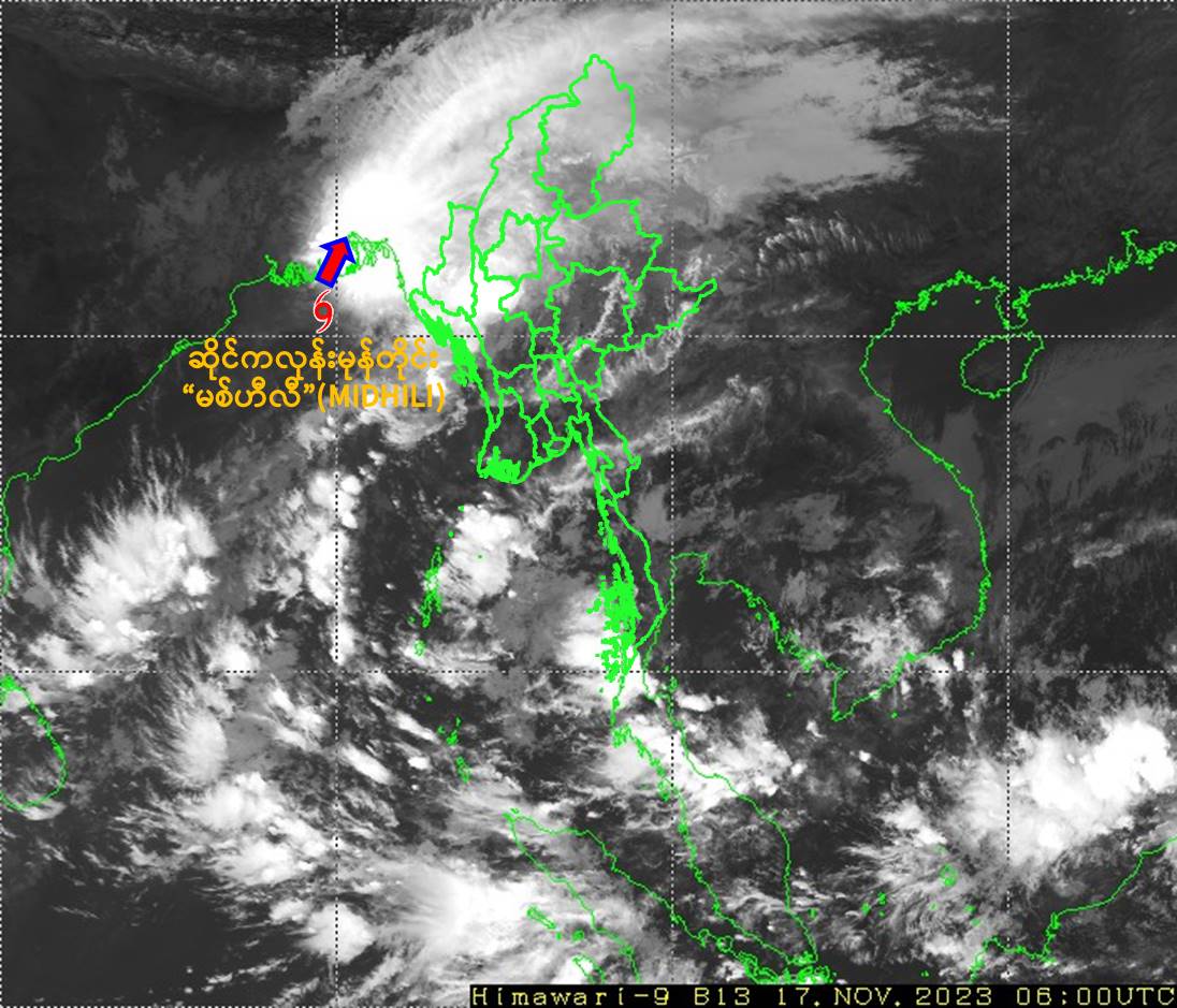 ဘင်္ဂလားပင်လယ်အော်အခြေအနေ။ ယနေ့မြန်မာစံတော်ချိန် (၁၂:၃၀)နာရီအချိန် တိုင်းထွာချက်များအရ ဘင်္ဂလားပင်လယ်အော်အနောက်မြောက်ပိုင်းတွင် ဖြစ်ပေါ်နေသော ဆိုင်ကလုန်းမုန်တိုင်း(Cyclonic Storm) “မစ်ဟီလီ”(MIDHILI)သည် မြောက်-အရှေ့မြောက်ဘက်သို့ ရွေ့လျားခဲ့ပြီး၊ ဘင်္ဂလားပင်လယ်အော်အနောက်မြောက်ပိုင်းနှင့် ယင်းနှင့် ဆက်စပ်လျက်ရှိသော ဘင်္ဂလားပင်လယ်အော်အရှေ့မြောက်ပိုင်းသို့ ရောက်ရှိခဲ့ကာ၊ မြန်မာနိုင်ငံ၊ စစ်တွေမြို့(Sittwe)၏ အနောက်-အနောက်မြောက်ဘက် ရေမိုင် (၂၂၀)မိုင်ခန့်၊ မောင်တောမြို့(Maungdaw)၏ အနောက်ဘက် ရေမိုင် (၁၈၅)မိုင်ခန့်၊ အိန္ဒိယနိုင်ငံ၊ ပါရာဒစ်မြို့(Paradip)၏ အရှေ့-အရှေ့မြောက်ဘက် ရေမိုင် (၁၄၅)မိုင်ခန့်၊ ဒီဂါမြို့(Digha)၏ အရှေ့-အရှေ့တောင်ဘက် ရေမိုင် (၁၀၀)မိုင်ခန့်နှင့် ဘင်္ဂလားဒေ့ရှ်နိုင်ငံ၊ ခီပူပါရာမြို့(Khepupara)၏ အနောက်တောင်ဘက် ရေမိုင် (၉၀)မိုင်ခန့်အကွာ ပင်လယ်ပြင်ကို ဗဟိုပြု နေပါသည်။ ဘင်္ဂလားပင်လယ်အော်မြောက်ပိုင်းတွင် တိမ်ထူထပ်နေပြီး၊ ကပ္ပလီပင်လယ်ပြင်နှင့် ကျန်ဘင်္ဂလားပင်လယ်အော်တို့တွင် တိမ်အသင့်အတင့်မှ တိမ်ထူထပ်နေပါသည်။
