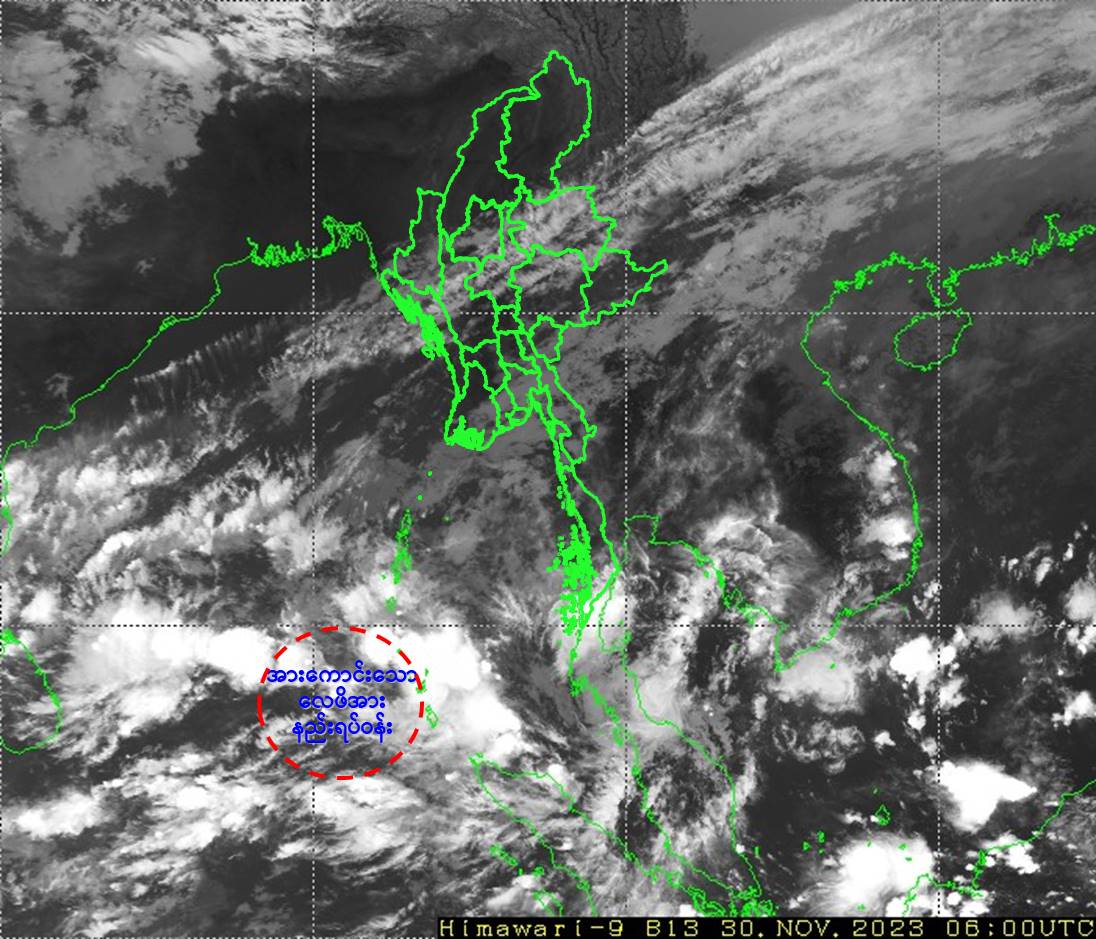 ဘင်္ဂလားပင်လယ်အော်အခြေအနေ။ ယနေ့မြန်မာစံတော်ချိန် (၁၂:၃၀)နာရီအချိန်တိုင်းထွာချက်များအရ ဘင်္ဂလားပင်လယ်အော်အရှေ့တောင်ပိုင်းတွင် ဖြစ်ပေါ်နေသော အားကောင်းသောလေဖိအားနည်းရပ်ဝန်း(Well Marked Low Pressure Area)သည် ဆက်လက်တည်ရှိနေပါသည်။ အဆိုပါ အားကောင်းသောလေဖိအားနည်း ရပ်ဝန်းသည် အနောက်-အနောက်မြောက်ဘက်သို့ ရွေ့လျားနိုင်ပြီး၊ နောက် (၂၄)နာရီအတွင်း မုန်တိုင်းငယ်(Depression)အဖြစ်သို့လည်းကောင်း၊ (၃.၁၂.၂၀၂၃) ရက်နေ့တွင် ဘင်္ဂလားပင်လယ်အော် အနောက်တောင်ပိုင်း၌ ဆိုင်ကလုန်းမုန်တိုင်း(Cyclonic Storm)အဖြစ်သို့လည်းကောင်း တဖြည်းဖြည်း အားကောင်းလာနိုင်သည်ဟု ခန့်မှန်းရပါသည်။ ကပ္ပလီပင်လယ်ပြင်နှင့် ဘင်္ဂလားပင်လယ်အော်တို့တွင် တိမ်အသင့်အတင့်မှ တိမ်ထူထပ်နေပါသည်။