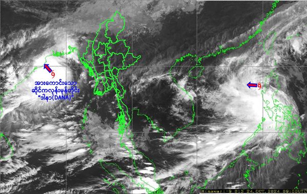 ဘင်္ဂလားပင်လယ်အော်အခြေအနေ။ ယနေ့မြန်မာစံတော်ချိန် (၁၂:၃၀)နာရီအချိန် တိုင်းထွာချက်များအရ ဘင်္ဂလားပင်လယ်အော်အနောက် မြောက်ပိုင်းနှင့် ယင်းနှင့်ဆက်စပ်လျက်ရှိသော ဘင်္ဂလားပင်လယ်အော်အလယ်ပိုင်းတို့တွင် ဖြစ်ပေါ်နေသော အားကောင်းသောဆိုင်ကလုန်း မုန်တိုင်း“ဒါနာ”(DANA)သည် မြောက်-အနောက်မြောက်ဘက်သို့ ရွေ့လျားခဲ့ပြီး၊ မြန်မာနိုင်ငံ၊ ဂွမြို့(Gwa)၏ အနောက်-အနောက်မြောက် ဘက် ရေမိုင် ၃၉၀ မိုင်ခန့်၊ အိန္ဒိယနိုင်ငံ၊ ဩရိဿပြည်နယ်၊ ဒမ်မရာမြို့(Dhamara)၏ တောင်-အရှေ့တောင်ဘက် ရေမိုင် ၁၂၀ မိုင်ခန့်အကွာ ပင်လယ်ပြင်ကို ဗဟိုပြုနေပါသည်။ ဗဟိုချက်လေဖိအား ၉၈၈ ဟက်တိုပါစကယ်နှင့် အမြင့်ဆုံးလေတိုက်နှုန်းမှာ တစ်နာရီလျှင် မိုင် ၆၀ မှ ၆၅ မိုင်နှုန်းခန့် ဖြစ်ပါသည်။ ကပ္ပလီပင်လယ်ပြင်တောင်ပိုင်း၊ ဘင်္ဂလားပင်လယ်အော်မြောက်ပိုင်း၊ အနောက်အလယ်ပိုင်းနှင့် တောင်ပိုင်းတို့တွင် တိမ်ထူထပ်နေပြီး၊ ကပ္ပလီပင်လယ်ပြင်မြောက်ပိုင်းနှင့် ကျန်ဘင်္ဂလားပင်လယ်အော်တို့တွင် တိမ်အသင့်အတင့်မှ တိမ်ထူထပ်နေပါသည်။