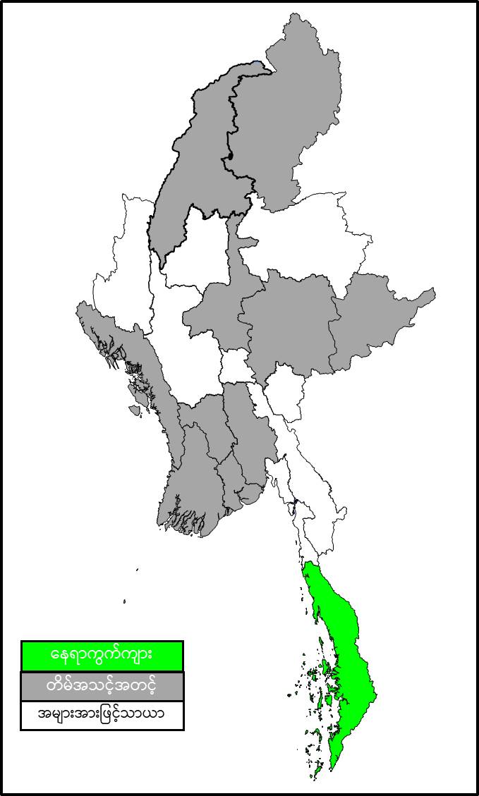 မနက်ဖြန်နံနက်အထိခန့်မှန်းချက်။ တနင်္သာရီတိုင်းဒေသကြီးတွင် နေရာကွက်ကျား မိုးအနည်းငယ် ထစ်ချုန်းရွာနိုင်ပါသည်။ ရွာရန်ရာနှုန်း(၆၀) ဖြစ်ပါသည်။ စစ်ကိုင်းတိုင်းဒေသကြီးအထက်ပိုင်း၊ မန္တလေးတိုင်းဒေသကြီး၊ ပဲခူးတိုင်းဒေသကြီး၊ ရန်ကုန်တိုင်းဒေသကြီး၊ ဧရာဝတီတိုင်းဒေသကြီး၊ ကချင်ပြည်နယ်၊ ရှမ်းပြည်နယ်(တောင်ပိုင်းနှင့် အရှေ့ပိုင်း)နှင့် ရခိုင်ပြည်နယ်တို့တွင် တိမ်အသင့်အတင့် ဖြစ်ထွန်းပြီး၊ ကျန်တိုင်းဒေသကြီးနှင့် ပြည်နယ်တို့တွင် အများအားဖြင့် သာယာမည်။