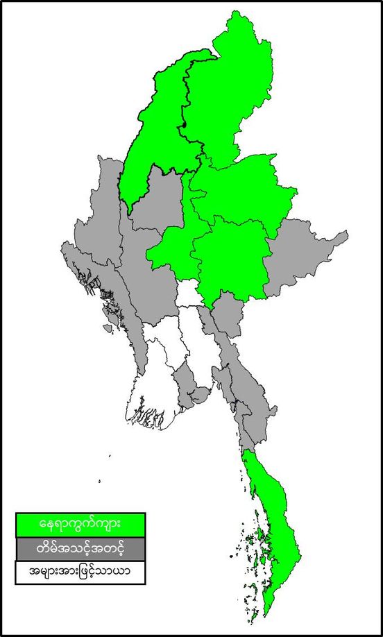 မနက်ဖြန်နံနက်အထိခန့်မှန်းချက်။ စစ်ကိုင်းတိုင်းဒေသကြီးအထက်ပိုင်း၊ မန္တလေးတိုင်းဒေသကြီး၊ တနင်္သာရီတိုင်းဒေသကြီး၊ ကချင်ပြည်နယ်နှင့် ရှမ်းပြည်နယ်(မြောက်ပိုင်းနှင့် တောင်ပိုင်း)တို့တွင် နေရာကွက်ကျား မိုးအနည်းငယ် ထစ်ချုန်းရွာနိုင်ပါသည်။ ရွာရန်ရာနှုန်း(၆၀) ဖြစ်ပါသည်။ နေပြည်တော်၊ ပဲခူးတိုင်းဒေသကြီးနှင့် ဧရာဝတီတိုင်းဒေသကြီးတို့တွင် အများအားဖြင့် သာယာပြီး၊ ကျန်တိုင်းဒေသကြီးနှင့် ပြည်နယ်တို့တွင် တိမ်အသင့် အတင့် ဖြစ်ထွန်းမည်။