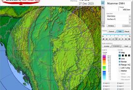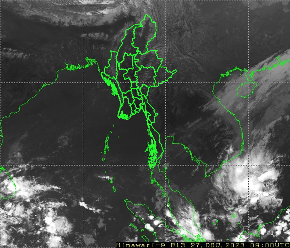ဘင်္ဂလားပင်လယ်အော်အ‌ခြေအနေ။ ဘင်္ဂလားပင်လယ်အော်တောင်ပိုင်းတွင် တိမ်အသင့်အတင့်မှ တိမ်ထူထပ်နေပြီး၊ ကပ္ပလီပင်လယ်ပြင်နှင့် ကျန်ဘင်္ဂလားပင်လယ်အော်တို့တွင် တိမ်အနည်းငယ် ဖြစ်ထွန်းနေပါသည်။