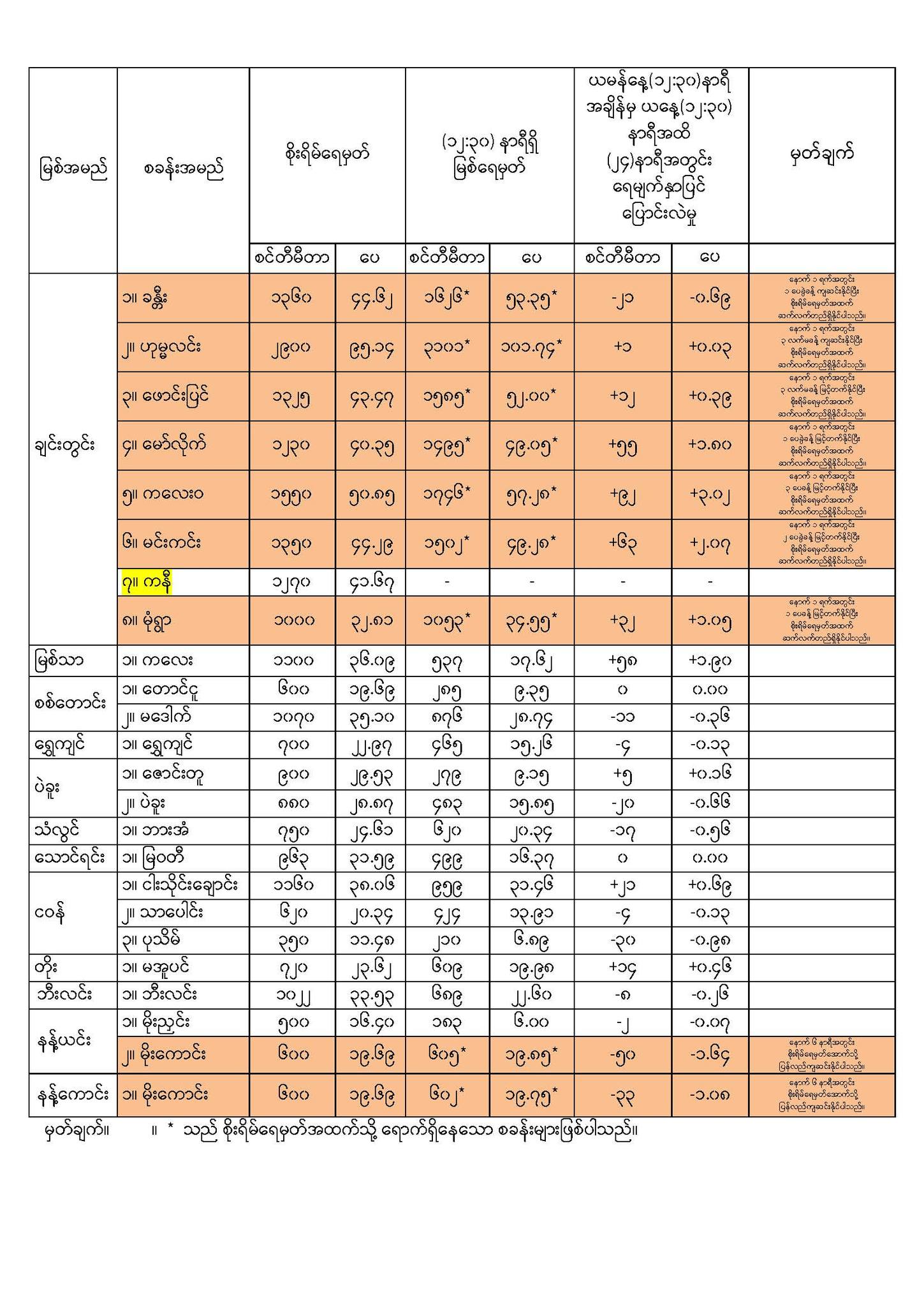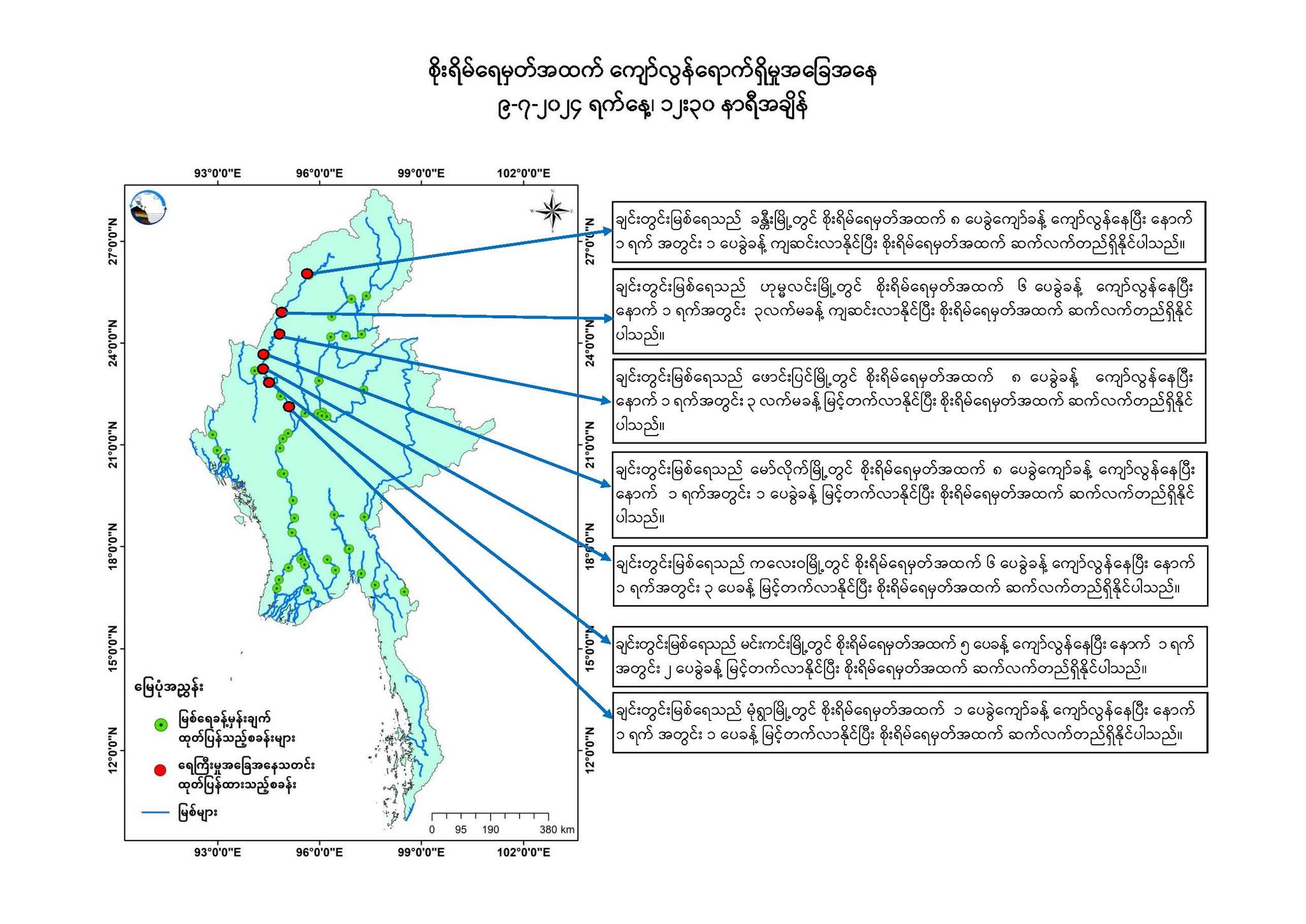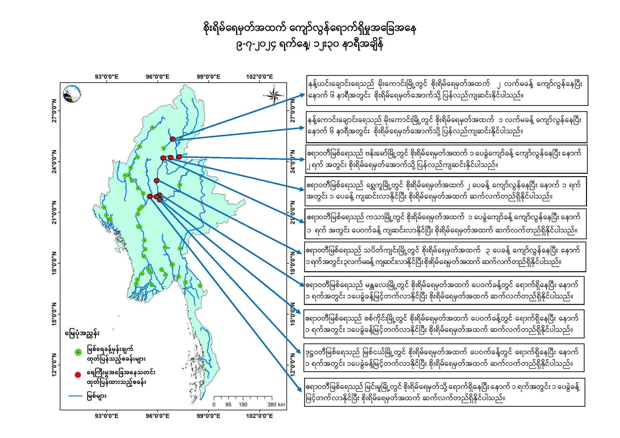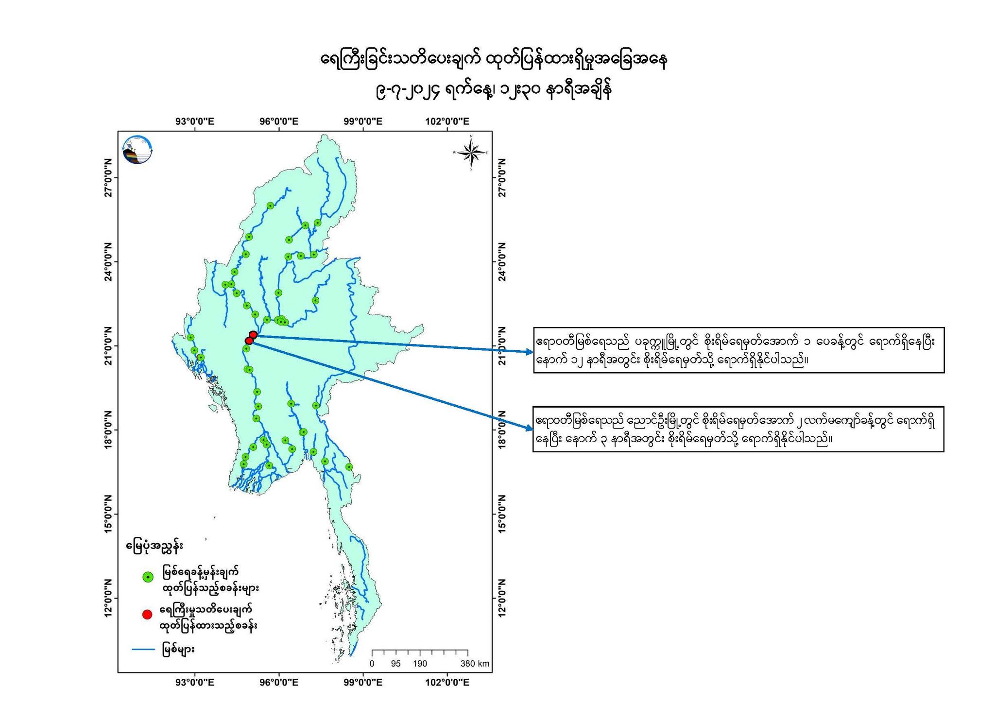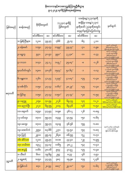 Jul 9,2024 |01:15 | ၉-၇-၂၀၂၄ မိုးလေဝသနှင့်ဇလဗေဒညွှန်ကြားမှုဦးစီးဌာနမှ ၉-၇-၂၀၂၄ ရက်နေ့ နေ့လယ်(၁၂:၃၀)နာရီအချိန်တွင် တိုင်းတာရရှိသော မြစ်ရေအခြေအနေများကိုသိရှိနိုင်ပါရန် ဖော်ပြလိုက်ပါတယ်....... Crd> မိုး/ဇလ