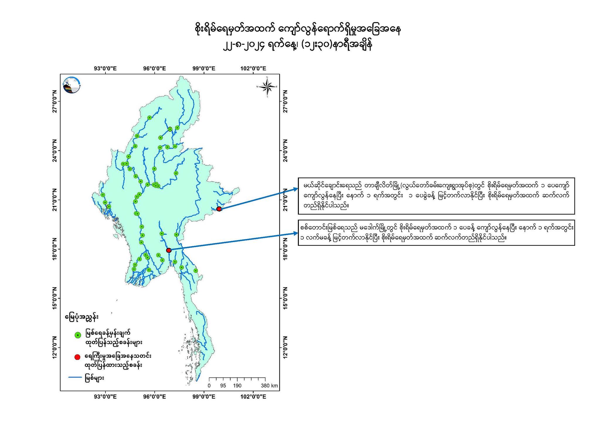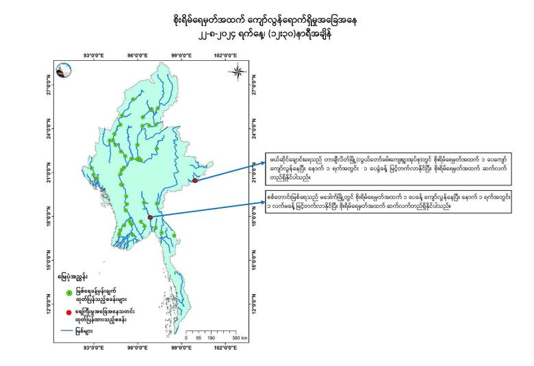 မိုးလေဝသနှင့်ဇလဗေဒညွှန်ကြားမှုဦးစီးဌာနမှ ၂၂-၈-၂၀၂၄ ရက်နေ့ နေ့လယ်(၁၂:၃၀)နာရီအချိန်တွင် တိုင်းတာရရှိသော မြစ်ရေအခြေအနေများကိုသိရှိနိုင်ပါရန် ဖော်ပြလိုက်ပါတယ်…