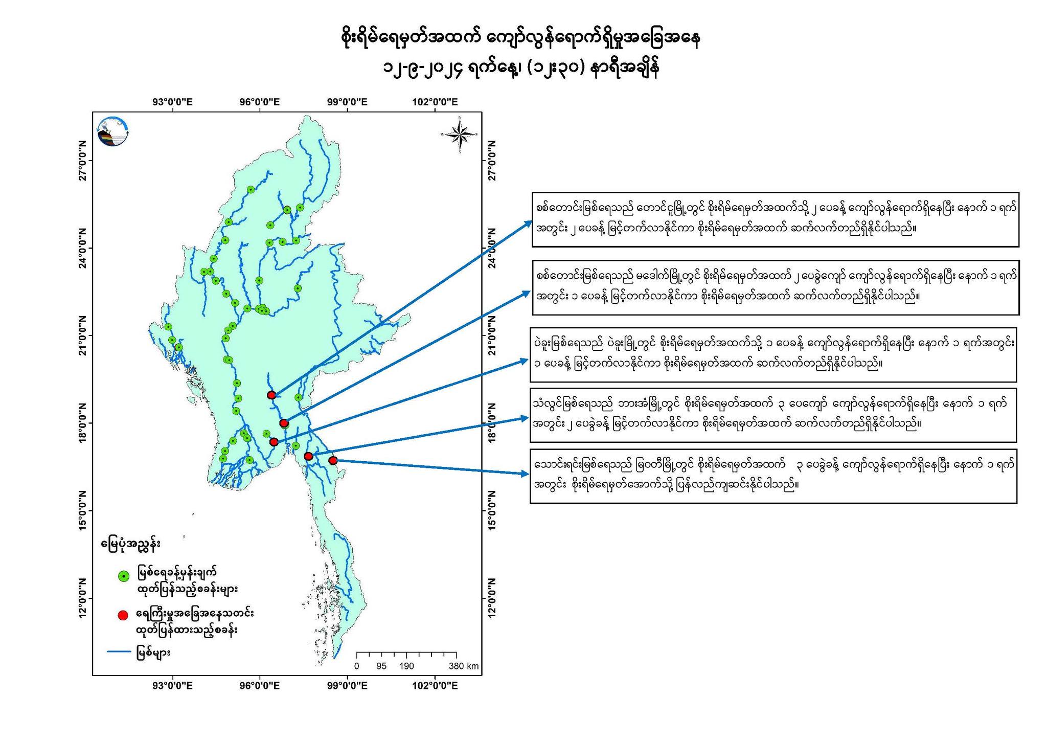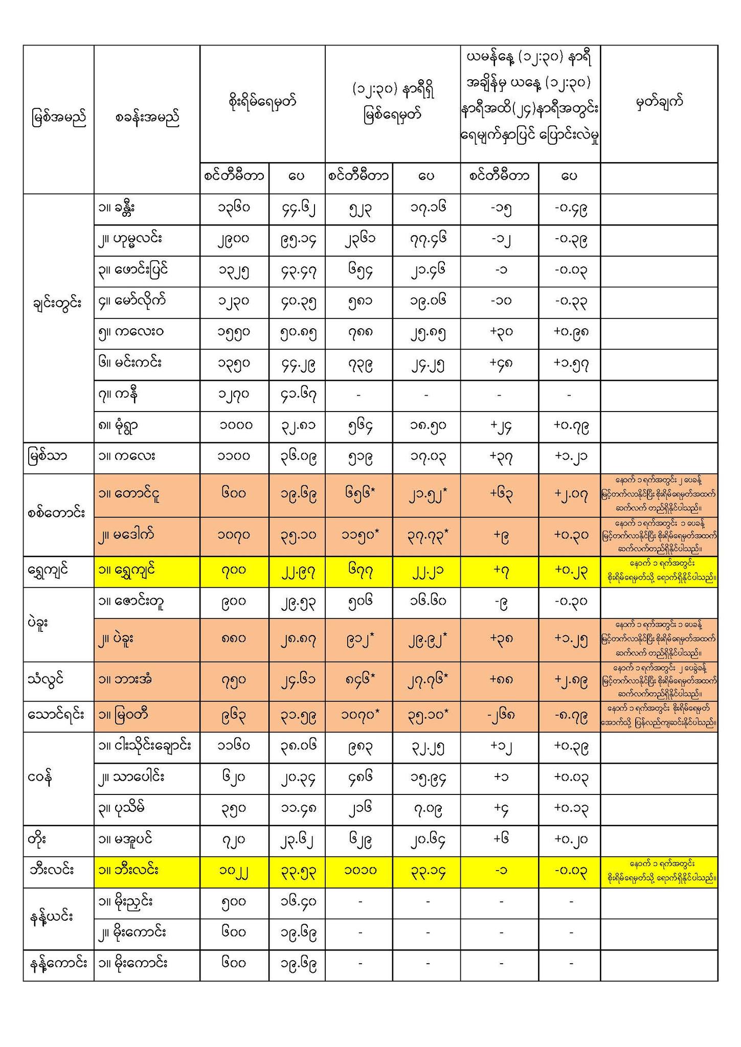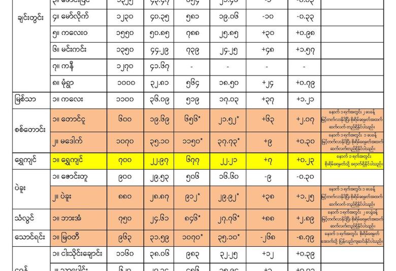 Sep 12,2024 |01:10 | ၁၂-၉-၂၀၂၄ မိုးလေဝသနှင့်ဇလဗေဒညွှန်ကြားမှုဦးစီးဌာနမှ ၁၂-၉-၂၀၂၄ ရက်နေ့ နေ့လယ်(၁၂:၃၀)နာရီအချိန်တွင် တိုင်းတာရရှိသော မြစ်ရေအခြေအနေများကိုသိရှိနိုင်ပါရန် ဖော်ပြလိုက်ပါတယ်....... Crd> မိုး/ဇလ