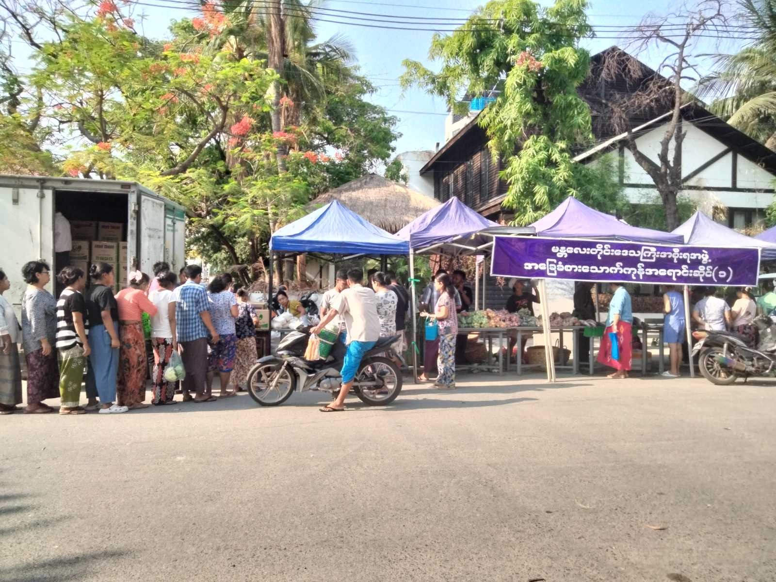 စီးပွားရေးနှင့် ကူးသန်းရောင်းဝယ်ရေးဝန်ကြီးဌာနနှင့် မြန်မာနိုင်ငံကုန်သည်များနှင့် စက်မှုလက်မှုလုပ်ငန်း ရှင်များအသင်းချုပ်(UMFCCI) တို့၏ စီစဉ်မှုဖြင့် ဆန်၊ ဆီ၊ ဆား၊ ပဲ၊ ငါးပိနှင့် ကုန်မျိုးစုံ ဈေးကားများသည် ပြည်ထောင်စုနယ်မြေ၊ နေပြည်တော်၊ စစ်ကိုင်းနှင့် မန္တလေးမြို့များအတွင်း ငလျင်ဒဏ်သင့် ဝန်ထမ်းအိမ်ရာ များသို့ မတ် ၃၀ ရက်မှစ၍ အိမ်တိုင်ရာရောက် သွားရောက်ကာ သက်သာသောဈေးနှုန်းများဖြင့် ရောင်းချပေး လျက်ရှိရာ ယနေ့တွင် နှစ်ဆယ့်ခြောက်ရက်မြောက်နေ့အဖြစ် ဈေးကား ၇ စီးဖြင့် လှည့်လည်ရောင်းချ ပေးလျက်ရှိသည်။