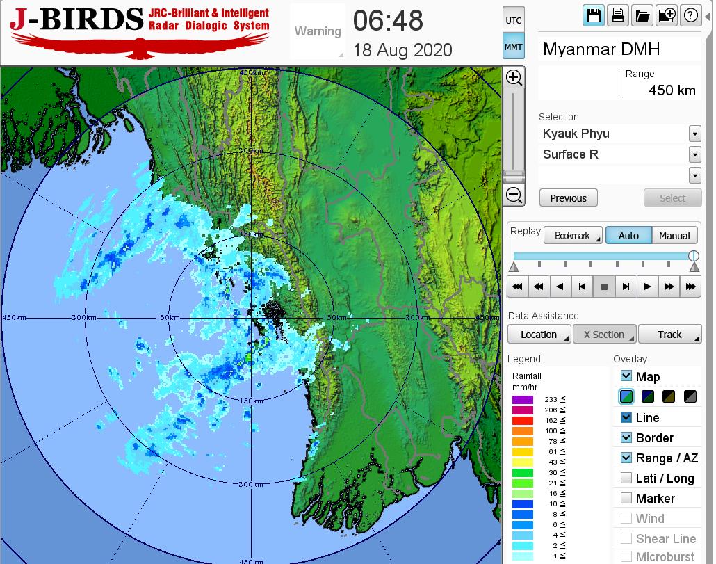ယနေ့ညနေအထိ ခန့်မှန်းချက်အနေဖြင့် စစ်ကိုင်းတိုင်းဒေသကြီး အောက်ပိုင်း၊ တနင်္သာရီတိုင်းဒေသကြီးနှင့် ကယားပြည်နယ်တို့တွင် နေရာကျဲကျဲ၊ စစ်ကိုင်းတိုင်းဒေသကြီး အထက်ပိုင်း၊ မန္တလေးတိုင်းဒေသကြီးနှင့် မကွေးတိုင်းဒေသကြီးတို့တွင် နေရာစိပ်စိပ်နှင့် ကျန်တိုင်းဒေသကြီးနှင့် ပြည်နယ်တို့တွင် နေရာအနှံ့အပြား မိုးထစ်ချုန်းရွာပြီး၊ ရခိုင်ပြည်နယ်တွင် ဒေသအလိုက်နှင့် နေပြည်တော်၊ စစ်ကိုင်းတိုင်းဒေသကြီး အထက်ပိုင်းနှင့် ကချင်ပြည်နယ်တို့တွင် နေရာကွက်၍ မိုးကြီးနိုင်သည်။ ရွာရန်ရာနှုန်းပြည့် ဖြစ်သည်။