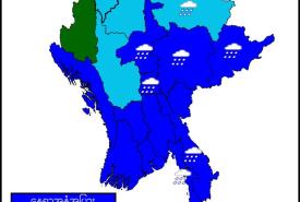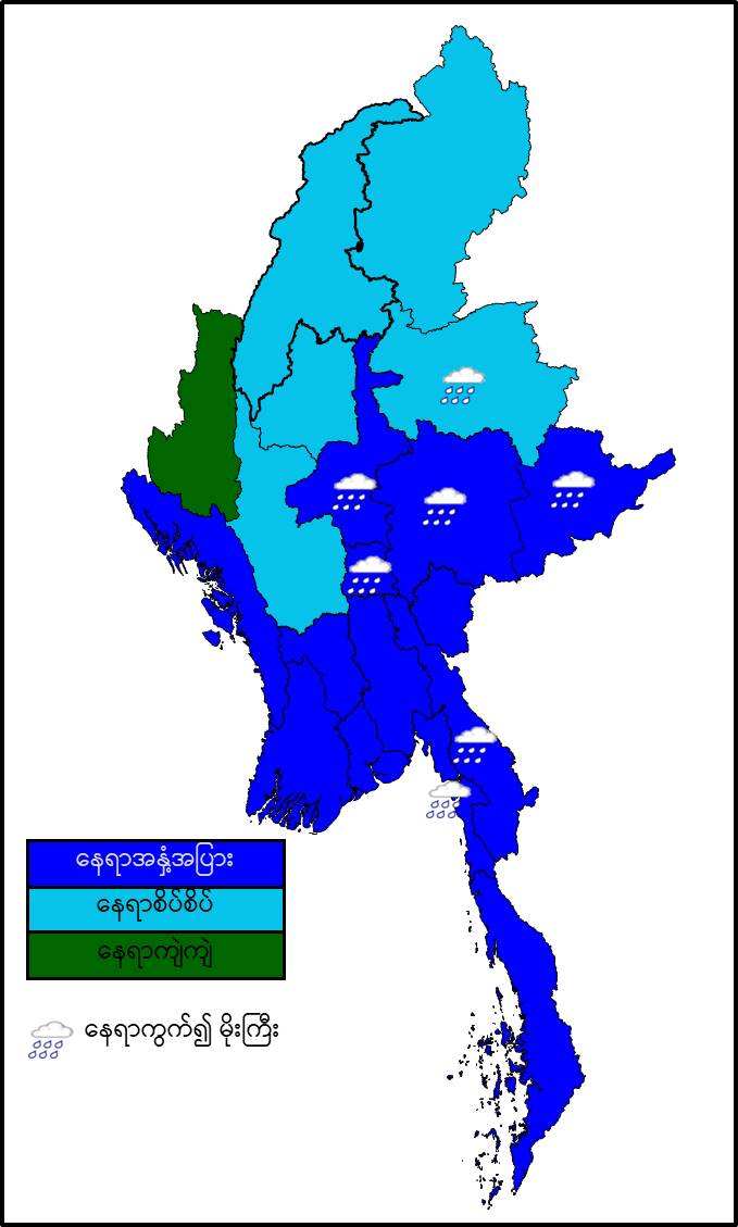 မနက်ဖြန်နံနက်အထိခန့်မှန်းချက်။ ချင်းပြည်နယ်တွင် နေရာကျဲကျဲ၊ စစ်ကိုင်းတိုင်းဒေသကြီး၊ မကွေးတိုင်းဒေသကြီးနှင့် ကချင်ပြည်နယ်တို့တွင် နေရာစိပ်စိပ်နှင့် ကျန်တိုင်းဒေသကြီးနှင့် ပြည်နယ်တို့တွင် နေရာအနှံ့အပြား မိုးထစ်ချုန်းရွာပြီး၊ နေပြည်တော်၊ မန္တလေးတိုင်းဒေသကြီး၊ ရှမ်းပြည်နယ်၊ ကရင်ပြည်နယ်နှင့် မွန်ပြည်နယ်တို့တွင် နေရာကွက်၍ မိုးကြီးနိုင်ပါသည်။ ရွာရန်ရာနှုန်းပြည့် ဖြစ်ပါသည်။