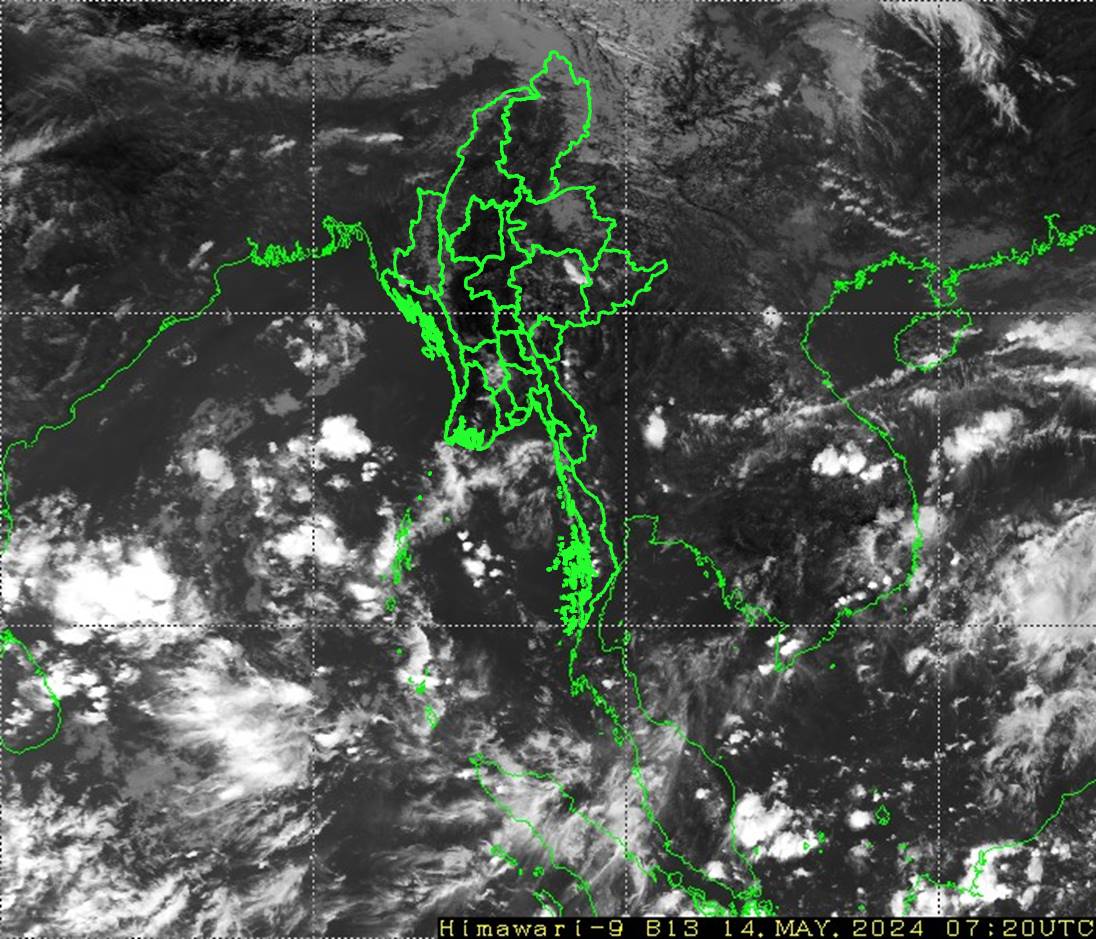 ယမန်နေ့နံနက်(၀၉:၃၀)နာရီအချိန်မှ ယနေ့နံနက်(၀၉:၃၀)နာရီအချိန်အထိ မိုးလေဝသ တိုင်းထွာချက်အကျဉ်းချုပ်။ လွန်ခဲ့သော(၂၄)နာရီအတွင်းက တနင်္သာရီတိုင်းဒေသကြီးတွင် နေရာအနှံ့အပြား၊ ရှမ်းပြည်နယ်(တောင်ပိုင်း)နှင့် ကရင်ပြည်နယ်တို့တွင် နေရာစိပ်စိပ်၊ ဧရာဝတီတိုင်းဒေသကြီးနှင့် မွန်ပြည်နယ်တို့တွင် နေရာကျဲကျဲနှင့် နေပြည်တော်၊ စစ်ကိုင်းတိုင်းဒေသကြီးအောက်ပိုင်း၊ မန္တလေးတိုင်းဒေသကြီး၊ ပဲခူးတိုင်းဒေသကြီး၊ ရန်ကုန်တိုင်းဒေသကြီး၊ ရှမ်းပြည်နယ်(မြောက်ပိုင်း)၊ ချင်းပြည်နယ်နှင့် ကယားပြည်နယ်တို့တွင် နေရာကွက်ကျား မိုးထစ်ချုန်းရွာခဲ့ပြီး၊ ကျန်တိုင်းဒေသကြီးနှင့် ပြည်နယ်တို့တွင် တိမ်အသင့်အတင့် ဖြစ်ထွန်းခဲ့ပါသည်။ နေ့အပူချိန်များမှာ မွန်ပြည်နယ်တွင် မေလ၏ ပျမ်းမျှအပူချိန်ထက် ၈ ဒီဂရီဆဲလ်စီးယပ်၊ ပဲခူးတိုင်းဒေသကြီးနှင့် ကရင်ပြည်နယ်တို့တွင် မေလ၏ ပျမ်းမျှအပူချိန်တို့ထက် ၅ ဒီဂရီဆဲလ်စီးယပ်၊ နေပြည်တော်၊ စစ်ကိုင်းတိုင်းဒေသကြီး၊ မန္တလေးတိုင်းဒေသကြီး၊ မကွေးတိုင်းဒေသကြီး၊ ရန်ကုန်တိုင်းဒေသကြီး၊ ဧရာဝတီတိုင်းဒေသကြီး၊ တနင်္သာရီတိုင်းဒေသကြီး၊ ကချင် ပြည်နယ်နှင့် ရှမ်းပြည်နယ်(အရှေ့ပိုင်း)တို့တွင် မေလ၏ ပျမ်းမျှအပူချိန်တို့ထက် ၃ ဒီဂရီဆဲလ်စီးယပ်မှ ၄ ဒီဂရီဆဲလ်စီးယပ်အထိနှင့် ရှမ်းပြည်နယ်(မြောက်ပိုင်းနှင့် တောင်ပိုင်း)၊ ရခိုင်ပြည်နယ်နှင့် ကယားပြည်နယ်တို့တွင် မေလ၏ ပျမ်းမျှအပူချိန်တို့ထက် ၂ ဒီဂရီဆဲလ်စီးယပ်ပိုခဲ့ပြီး၊ ချင်းပြည်နယ်တွင် မေလ၏ ပျမ်းမျှ အပူချိန်ခန့်သာ ရှိခဲ့ပါသည်။ ၁၃-၅-၂၀၂၄ ရက်နေ့တွင် ဖြစ်ပေါ်ခဲ့သော ထူးခြားသည့် နေ့အပူချိန်များမှာ ချောက်မြို့တွင် ၄၄.၆ ဒီဂရီဆဲလ်စီးယပ်၊ မြင်းခြံမြို့၊ ညောင်ဦးမြို့၊ မကွေးမြို့နှင့် တောင်တွင်းကြီးမြို့တို့တွင် ၄၃.၀ ဒီဂရီဆဲလ်စီးယပ်စီ၊ အောင်လံမြို့တွင် ၄၂.၇ ဒီဂရီဆဲလ်စီးယပ်၊ မြင်းမူမြို့တွင် ၄၂.၅ ဒီဂရီဆဲလ်စီးယပ်၊ ပြည်မြို့တွင် ၄၂.၄ ဒီဂရီဆဲလ်စီးယပ်၊ တံတားဦး(လေကြောင်းမိုးလေဝသ)နှင့် ဆင်ဖြူကျွန်းမြို့တို့တွင် ၄၂.၃ ဒီဂရီဆဲလ်စီးယပ်စီနှင့် ကျောက်ဆည်(လွန်ကျော်)တွင် ၄၂.၂ ဒီဂရီဆဲလ်စီးယပ်တို့ ဖြစ်ကြပါသည်။ မှတ်သားဖွယ်ရာ မိုးရေချိန်များမှာ ပေါင်မြို့တွင် ၁.၈၁ လက်မ၊ သထုံမြို့တွင် ၁.၆၄ လက်မ၊ ထားဝယ်မြို့တွင် ၁.၂၂ လက်မ၊ ပုသိမ်မြို့တွင် ၁.၁၄ လက်မ၊ ကန်ကြီးထောင့်မြို့တွင် ၁.၀၅ လက်မ၊ ကော့သောင်းမြို့တွင် ၀.၇၅ လက်မ၊ မြိတ်မြို့တွင် ၀.၄၃ လက်မ၊ မိုးကုတ်မြို့နှင့် လပွတ္တာမြို့တို့တွင် ၀.၂၀ လက်မစီ၊ မြဝတီမြို့တွင် ၀.၁၆ လက်မနှင့် ကျောက်မဲမြို့တွင် ၀.၁၂ လက်မတို့ ဖြစ်ကြပါသည်။