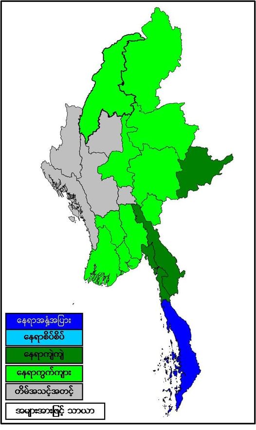 နောက်(၂)ရက်အတွက် ခန့်မှန်းချက်မှာ တနင်္သာရီတိုင်းဒေသကြီးတွင် နေရာကျဲကျဲနှင့် ကရင်ပြည်နယ် နှင့် မွန်ပြည်နယ်တို့တွင် နေရာကွက်ကျား မိုးဆက်လက်ထစ်ချုန်းရွာနိုင်သည်။