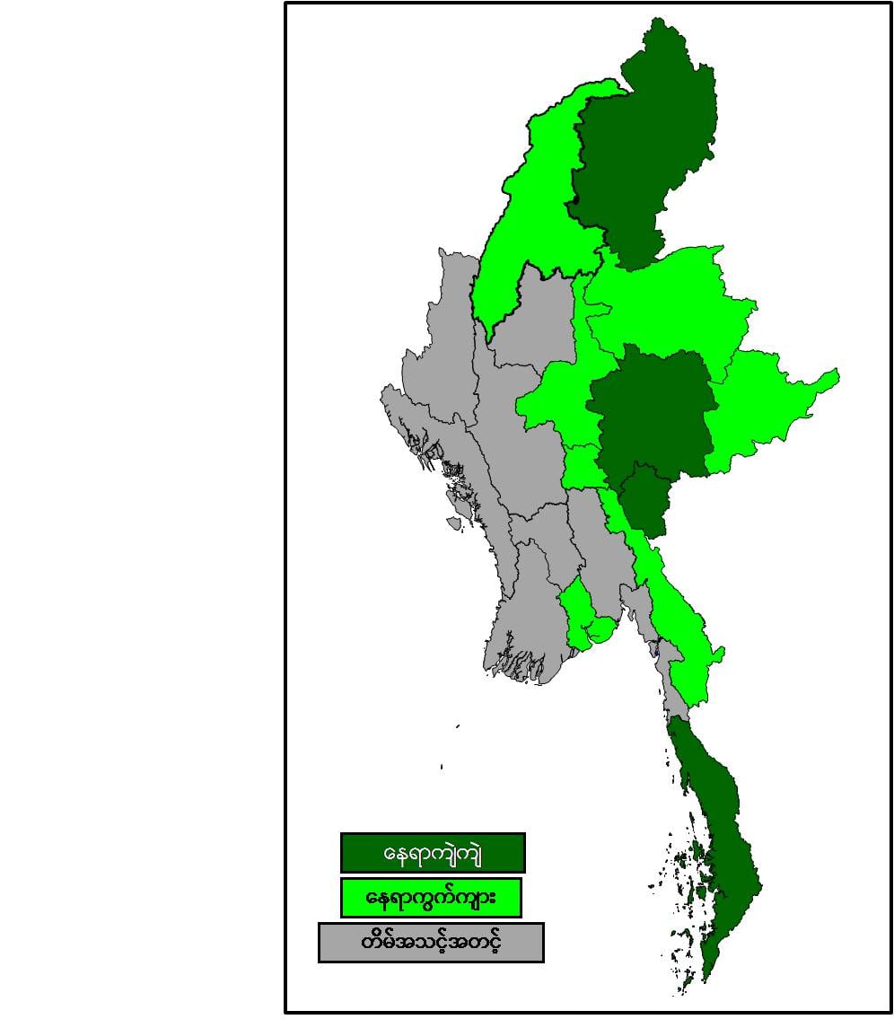 မနက်ဖြန်နံနက်အထိခန့်မှန်းချက်မှာ တနင်္သာရီတိုင်းဒေသကြီး၊ ကချင်ပြည်နယ်၊ ရှမ်းပြည်နယ် (တောင်ပိုင်း)နှင့် ကယားပြည်နယ်တို့တွင် နေရာကျဲကျဲနှင့် နေပြည်တော်၊ စစ်ကိုင်းတိုင်းဒေသကြီး အထက်ပိုင်း၊ မန္တလေးတိုင်းဒေသကြီး၊ ရန်ကုန်တိုင်းဒေသကြီး၊ ရှမ်းပြည်နယ်(မြောက်ပိုင်းနှင့် အရှေ့ပိုင်း)နှင့် ကရင်ပြည်နယ်တို့တွင် နေရာကွက်ကျားမိုးထစ်ချုန်းရွာမည်။ ရွာရန်ရာနှုန်း(၈၀) ဖြစ်သည်။ ကျန်တိုင်းဒေသကြီးနှင့် ပြည်နယ်တို့တွင် တိမ်အသင့်အတင့် ဖြစ်ထွန်းမည်။