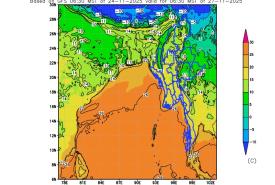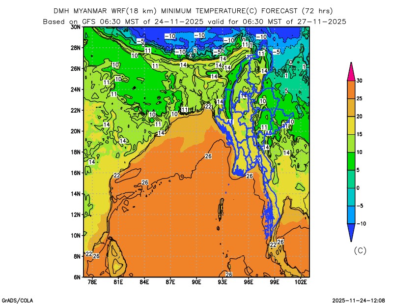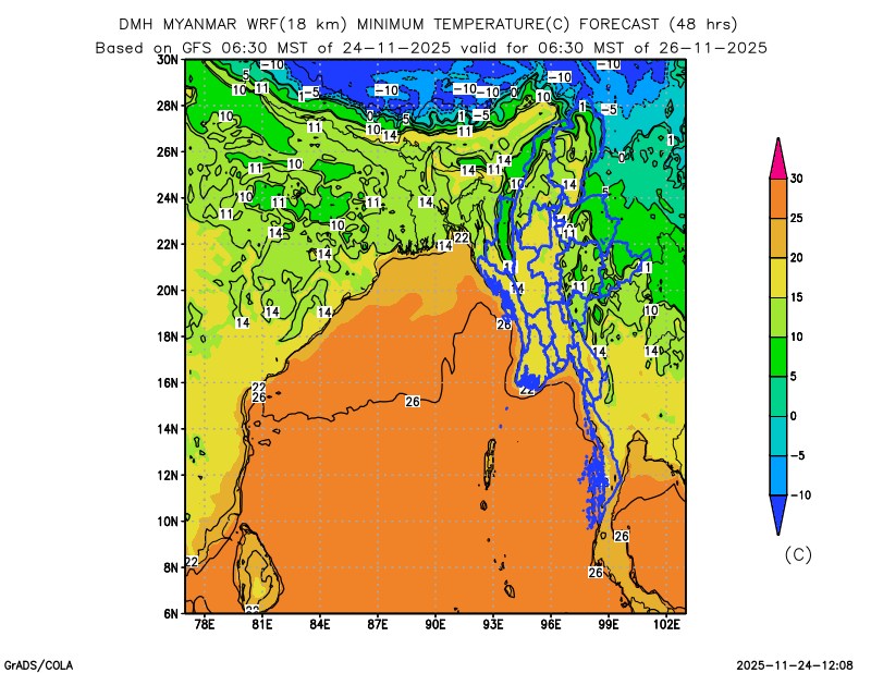 ယမန်နေ့နံနက် ၀၉:၃၀ နာရီအချိန်မှ ယနေ့နံနက် ၀၉:၃၀ နာရီအချိန်အထိ မိုးလေဝသတိုင်းထွာချက် အကျဉ်းချုပ်။ လွန်ခဲ့သော ၂၄ နာရီအတွင်းက ကချင်ပြည်နယ်တွင် နေရာကွက်ကျား မိုးထစ်ချုန်းရွာခဲ့ပြီး နေပြည်တော်၊ ရန်ကုန်တိုင်းဒေသကြီး၊ ပဲခူးတိုင်းဒေသကြီး၊ စစ်ကိုင်းတိုင်းဒေသကြီးအောက်ပိုင်း၊ ဧရာဝတီတိုင်းဒေသကြီး၊ ကယားပြည်နယ်၊ ချင်းပြည်နယ်နှင့် ရှမ်းပြည်နယ်(မြောက်ပိုင်း)တို့တွင် အများအားဖြင့် သာယာခဲ့ကာ ကျန်တိုင်းဒေသကြီးနှင့် ပြည်နယ်တို့တွင် တိမ်အသင့်အတင့် ဖြစ်ထွန်းခဲ့ပါသည်။ ညအပူချိန်များမှာ ချင်းပြည်နယ်တွင် နိုဝင်ဘာလ၏ ပျမ်းမျှအပူချိန်အောက် ၄ ဒီဂရီဆဲလ်စီးယပ်နှင့် နေပြည်တော်၊ ပဲခူးတိုင်းဒေသကြီး၊ ကယားပြည်နယ်နှင့် ရှမ်းပြည်နယ်(တောင်ပိုင်း)တို့တွင် နိုဝင်ဘာလ၏ ပျမ်းမျှအပူချိန်တို့အောက် ၂ ဒီဂရီဆဲလ်စီးယပ်လျော့နည်းခဲ့ပြီး ကချင်ပြည်နယ်တွင် နိုဝင်ဘာလ၏ ပျမ်းမျှအပူချိန်ထက် ၂ ဒီဂရီဆဲလ်စီးယပ်ပိုခဲ့ကာ ကျန်တိုင်းဒေသကြီးနှင့် ပြည်နယ်တို့တွင် နိုဝင်ဘာလ၏ ပျမ်းမျှအပူချိန်ခန့်သာ ရှိခဲ့ပါသည်။ ထူးခြားသည့် ညအပူချိန်များမှာ ဟားခါးမြို့တွင် ၀.၅ ဒီဂရီဆဲလ်စီးယပ်၊ လွိုင်လင်မြို့တွင် ၅.၄ ဒီဂရီဆဲလ်စီးယပ်၊ နမ့်စန်မြို့(ရှမ်းပြည်နယ်တောင်ပိုင်း)နှင့် ပင်လောင်းမြို့တို့တွင် ၇.၄ ဒီဂရီ ဆဲလ်စီးယပ်စီ၊ ဟဲဟိုးမြို့တွင် ၉.၀ ဒီဂရီဆဲလ်စီးယပ်၊ တောင်ကြီးမြို့တွင် ၁၀.၀ ဒီဂရီဆဲလ်စီးယပ်၊ မိုင်းယန်းမြို့တွင် ၁၁.၀ ဒီဂရီဆဲလ်စီးယပ်၊ လားရှိုးမြို့တွင် ၁၁.၂ ဒီဂရီ ဆဲလ်စီးယပ်နှင့် ပြင်ဦးလွင်မြို့တွင် ၁၁.၇ ဒီဂရီဆဲလ်စီးယပ်တို့ ဖြစ်ကြပါသည်။ မှတ်သားဖွယ်ရာ မိုးရေချိန်မှာ ပူတာအိုမြို့တွင် ၀.၂၀ လက်မ ဖြစ်ပါသည်။