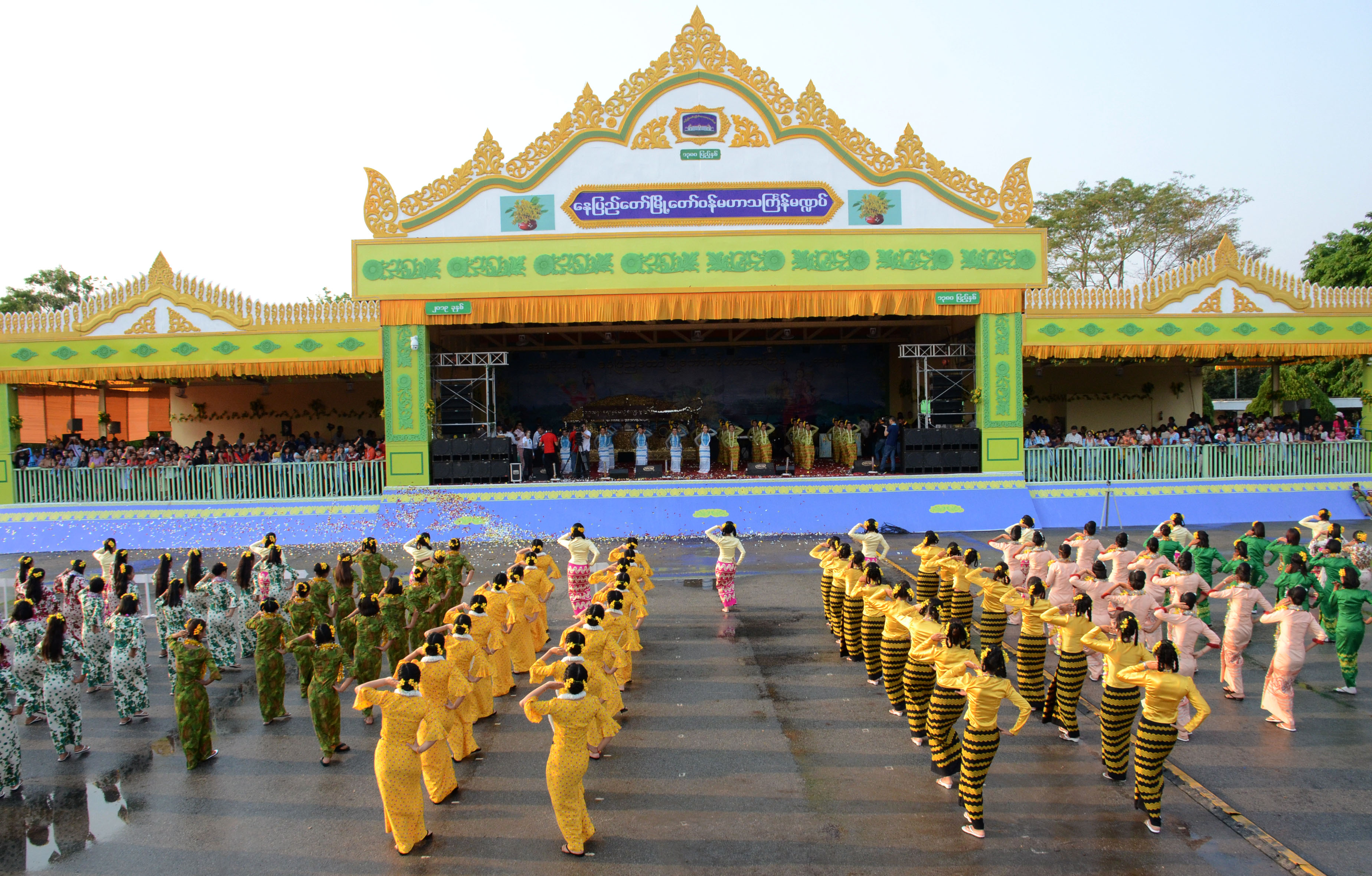 ရှေးဦးစွာ နေပြည်တော် မြို့တော်ဝန် မဟာသင်္ကြန်မဏ္ဍပ်တွင် ကပြဖျော်ဖြေခဲ့ကြသည့် ယိမ်းအကအဖွဲ့များက မဏ္ဍပ်ရှေ့မျက်နှာစာတွင် နေရာယူကြသည်။