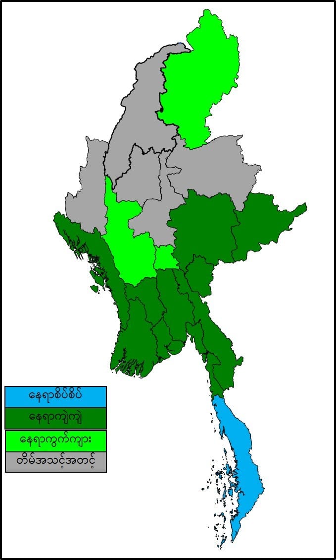 လွန်ခဲ့သော(၂၄)နာရီအတွင်းက တနင်္သာရီတိုင်းဒေသကြီးနှင့် ရှမ်းပြည်နယ် (တောင်ပိုင်းနှင့် အရှေ့ပိုင်း) တို့တွင် နေရာစိပ်စိပ်၊ ကယားပြည်နယ်တွင် နေရာကျဲကျဲနှင့် နေပြည်တော်၊ မကွေးတိုင်းဒေသကြီး၊ ပဲခူးတိုင်းဒေသကြီး၊ ရန်ကုန်တိုင်းဒေသကြီး၊ ဧရာဝတီတိုင်းဒေသကြီး၊ ကချင်ပြည်နယ်၊ ရခိုင်ပြည်နယ်နှင့် ကရင်ပြည်နယ်တို့တွင် နေရာကွက်ကျား မိုးထစ်ချုန်းရွာခဲ့ပြီး၊ ကျန်တိုင်းဒေသကြီးနှင့် ပြည်နယ်တို့တွင် တိမ်အသင့်အတင့် ဖြစ်ထွန်းခဲ့ပါသည်။