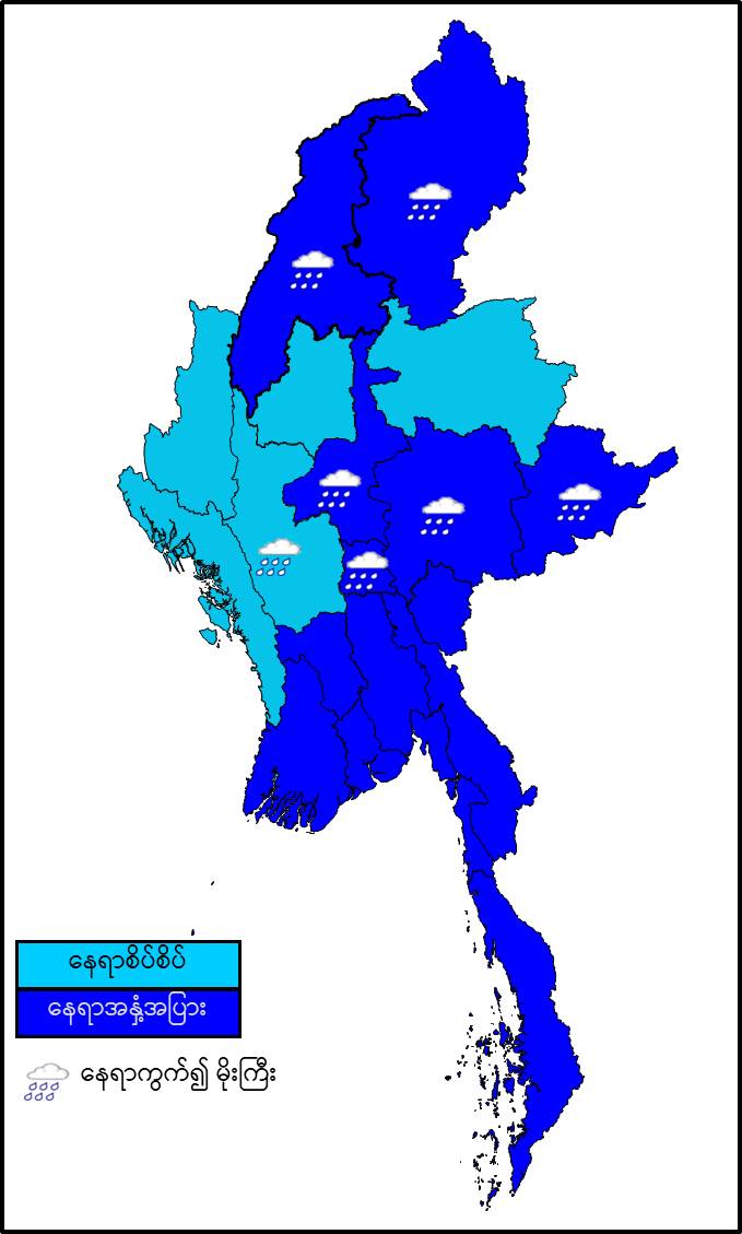 မနက်ဖြန်နံနက်အထိခန့်မှန်းချက်။ မကွေးတိုင်းဒေသကြီး၊ စစ်ကိုင်းတိုင်းဒေသကြီးအောက်ပိုင်း၊ ချင်းပြည်နယ်၊ ရခိုင်ပြည်နယ်နှင့် ရှမ်းပြည်နယ်(မြောက်ပိုင်း)တို့တွင် နေရာစိပ်စိပ်နှင့် ကျန်တိုင်းဒေသကြီးနှင့် ပြည်နယ်တို့တွင် နေရာအနှံ့အပြား မိုးထစ်ချုန်းရွာပြီး၊ နေပြည်တော်၊ မန္တလေးတိုင်းဒေသကြီး၊ မကွေးတိုင်းဒေသကြီး၊ စစ်ကိုင်းတိုင်းဒေသကြီးအထက်ပိုင်း၊ ကချင်ပြည်နယ်နှင့် ရှမ်းပြည်နယ်(တောင်ပိုင်းနှင့် အရှေ့ပိုင်း)တို့တွင် နေရာကွက်၍ မိုးကြီးနိုင်ပါသည်။ ရွာရန်ရာနှုန်းပြည့် ဖြစ်ပါသည်။