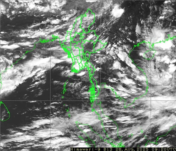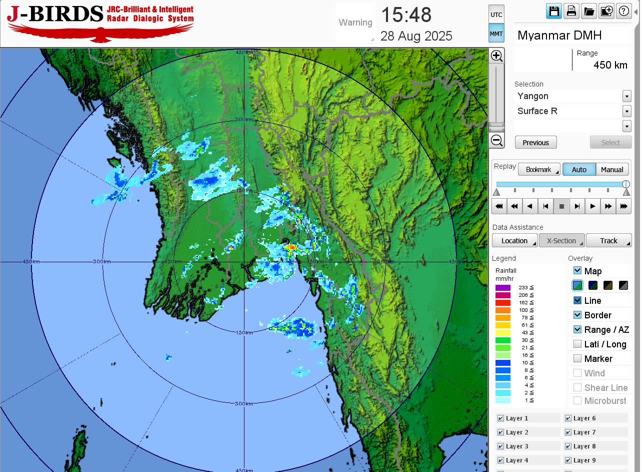 မိုးတိမ်တောင်ဖြစ်ပေါ်မှုအခြေအနေ။ ရန်ကုန်တိုင်းဒေသကြီး၊ မကွေးတိုင်းဒေသကြီး၊ ပဲခူးတိုင်းဒေသကြီး၊ စစ်ကိုင်းတိုင်းဒေသကြီးအထက်ပိုင်း၊ ဧရာဝတီတိုင်းဒေသကြီး၊ တနင်္သာရီတိုင်းဒေသကြီး၊ ကချင်ပြည်နယ်၊ ကရင်ပြည်နယ်၊ မွန်ပြည်နယ်၊ ချင်းပြည်နယ်၊ ရခိုင်ပြည်နယ်နှင့် ရှမ်းပြည်နယ်(မြောက်ပိုင်းနှင့် တောင်ပိုင်း)တို့တွင် မိုးတိမ်တောင်များ ဖြစ်ထွန်းမှုအားကောင်းလျက်ရှိပြီး၊ အဆိုပါ မိုးတိမ်တောင်များ ရွေ့လျားရာ နေရာတစ်လျှောက်တွင် မိုးရွာသွန်းခြင်းနှင့်အတူ လေပြင်းတိုက်ခတ်ခြင်း၊ မိုးထစ်ချုန်းခြင်း၊ မိုးကြိုးပစ်ခြင်း၊ လျှပ်စီးလက်ခြင်းနှင့် မိုးသီးကြွေခြင်းစသည့် မိုးလေဝသဖြစ်စဉ်များ ဖြစ်ပေါ်နိုင်ပါသဖြင့် ကြိုတင်သတိပြုနိုင်ပါရန် အကြံပြုအပ်ပါသည်။