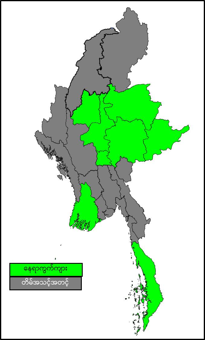 မနက်ဖြန်နံနက်အထိခန့်မှန်းချက်။ နေပြည်တော်၊ မန္တလေးတိုင်းဒေသကြီး၊ စစ်ကိုင်းတိုင်းဒေသကြီးအောက်ပိုင်း၊ ဧရာဝတီတိုင်းဒေသကြီး၊ တနင်္သာရီတိုင်းဒေသကြီးနှင့် ရှမ်းပြည်နယ်တို့တွင် နေရာကွက်ကျား မိုးအနည်းငယ် ရွာနိုင်ပါသည်။ ရွာရန်ရာနှုန်း ၆၀ ဖြစ်ပါသည်။ ကျန်တိုင်းဒေသကြီးနှင့် ပြည်နယ်တို့တွင် တိမ်အသင့်အတင့် ဖြစ်ထွန်းမည်။