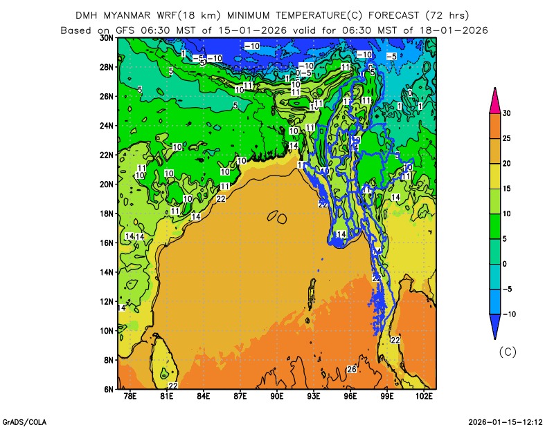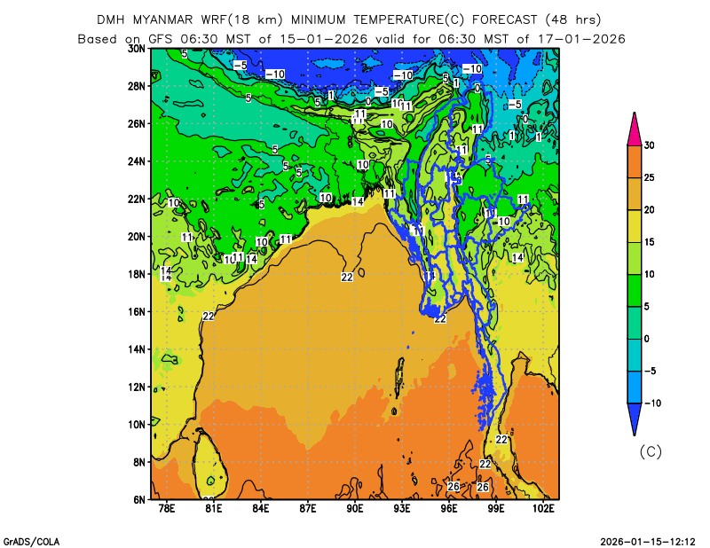 နောက် ၂ ရက်အတွက်ခန့်မှန်းချက်။ နေပြည်တော်၊ မန္တလေးတိုင်းဒေသကြီး၊ ပဲခူးတိုင်းဒေသကြီး၊ မကွေးတိုင်းဒေသကြီး၊ စစ်ကိုင်းတိုင်းဒေသကြီး၊ ကချင်ပြည်နယ်၊ ကယားပြည်နယ်နှင့် ရှမ်းပြည်နယ်တို့တွင် ညအပူချိန်များ အနည်းငယ် လျော့နည်းနိုင်ပါသည်။
