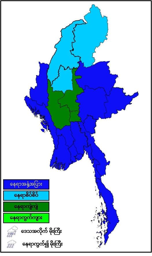 မနက်ဖြန်နံနက်အထိခန့်မှန်းချက်မှာ နေပြည်တော်၊ မန္တလေးတိုင်းဒေသကြီးနှင့် မကွေးတိုင်းဒေသကြီး တို့တွင် နေရာကျဲကျဲ၊ စစ်ကိုင်းတိုင်းဒေသကြီးနှင့် ကချင်ပြည်နယ်တို့တွင် နေရာစိပ်စိပ်နှင့် ကျန်တိုင်းဒေသကြီးနှင့် ပြည်နယ်တို့တွင် နေရာအနှံ့အပြား မိုးထစ်ချုန်းရွာမည်။ ရွာရန်ရာနှုန်းပြည့် ဖြစ်သည်။