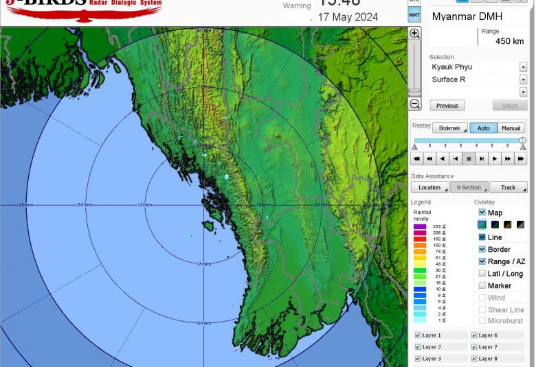 မိုးတိမ်တောင်ဖြစ်ပေါ်မှုအခြေအနေ။ ပဲခူးတိုင်းဒေသကြီး၊ ရန်ကုန်တိုင်းဒေသကြီး၊ ဧရာဝတီတိုင်းဒေသကြီး၊ တနင်္သာရီတိုင်းဒေသကြီး၊ ရှမ်းပြည်နယ်၊ ကရင်ပြည်နယ်နှင့် မွန်ပြည်နယ်တို့တွင် မိုးတိမ်တောင်များ ဖြစ်ထွန်းလျက်ရှိပြီး အဆိုပါ မိုးတိမ်တောင်များ ရွေ့လျားရာ နေရာတစ်လျှောက်တွင် မိုးရွာသွန်းခြင်းနှင့်အတူ လေပြင်းတိုက်ခတ်ခြင်း၊ မိုးထစ်ချုန်းခြင်း၊ မိုးကြိုးပစ်ခြင်း၊ လျှပ်စီးလက်ခြင်းနှင့် မိုးသီးကြွေခြင်းစသည့် မိုးလေဝသဖြစ်စဉ်များ ဖြစ်ပေါ်နိုင်ပါသဖြင့် ကြိုတင်သတိပြုနိုင်ပါရန် အကြံပြုအပ်ပါသည်။