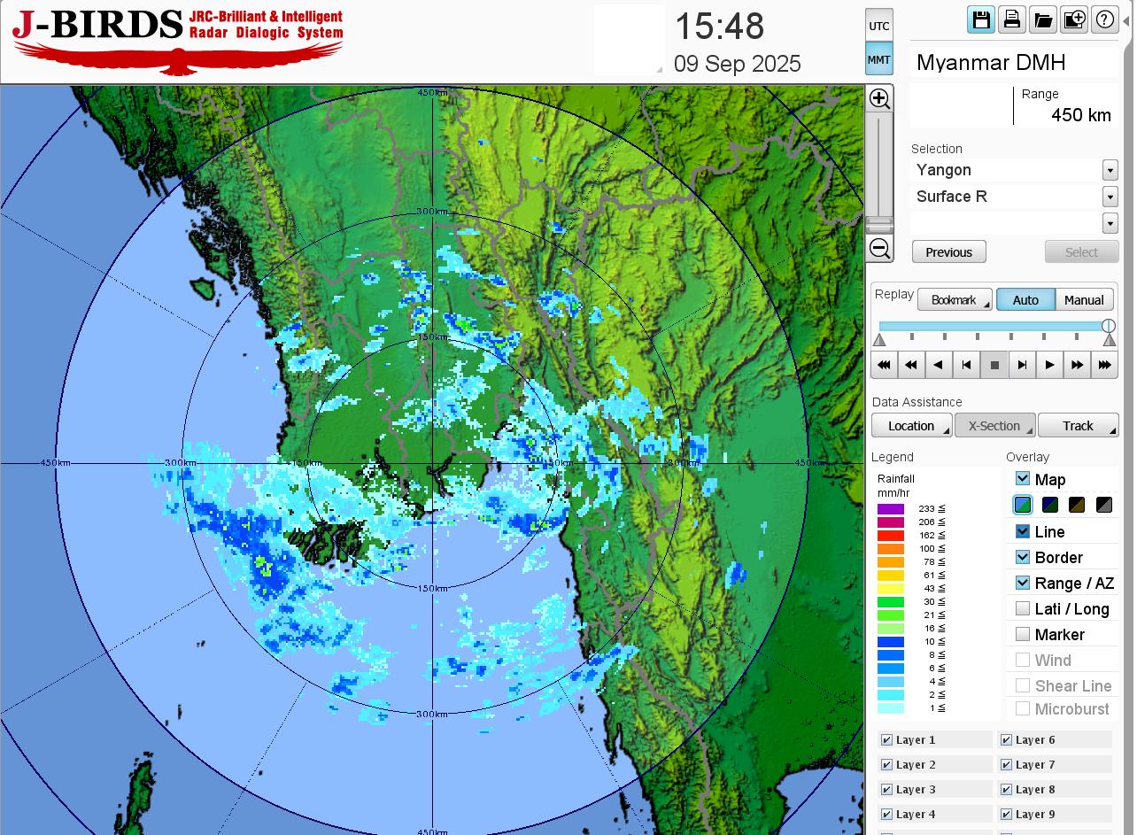 မိုးတိမ်တောင်ဖြစ်ပေါ်မှုအခြေအနေ။ ရန်ကုန်တိုင်းဒေသကြီး၊ မန္တလေးတိုင်းဒေသကြီး၊ စစ်ကိုင်းတိုင်းဒေသကြီးအထက်ပိုင်း၊ ပဲခူးတိုင်းဒေသကြီး၊ ဧရာဝတီတိုင်းဒေသကြီး၊ တနင်္သာရီတိုင်းဒေသကြီး၊ ကချင်ပြည်နယ်၊ ကယားပြည်နယ်၊ ကရင်ပြည်နယ်၊ ချင်းပြည်နယ်၊ မွန်ပြည်နယ်၊ ရခိုင်ပြည်နယ်နှင့် ရှမ်းပြည်နယ်တို့တွင် မိုးတိမ်တောင်များ ဖြစ်ထွန်းမှု အားကောင်းလျက်ရှိပြီး၊ အဆိုပါ မိုးတိမ်တောင်များ ရွေ့လျားရာနေရာတစ်လျှောက်တွင် မိုးရွာသွန်းခြင်းနှင့်အတူ လေပြင်းတိုက်ခတ်ခြင်း၊ မိုးထစ်ချုန်းခြင်း၊ မိုးကြိုးပစ်ခြင်း၊ လျှပ်စီးလက်ခြင်းနှင့် မိုးသီးကြွေခြင်းစသည့် မိုးလေဝသဖြစ်စဉ်များ ဖြစ်ပေါ်နိုင်ပါသဖြင့် ကြိုတင်သတိပြုနိုင်ပါရန် အကြံပြုအပ်ပါသည်။