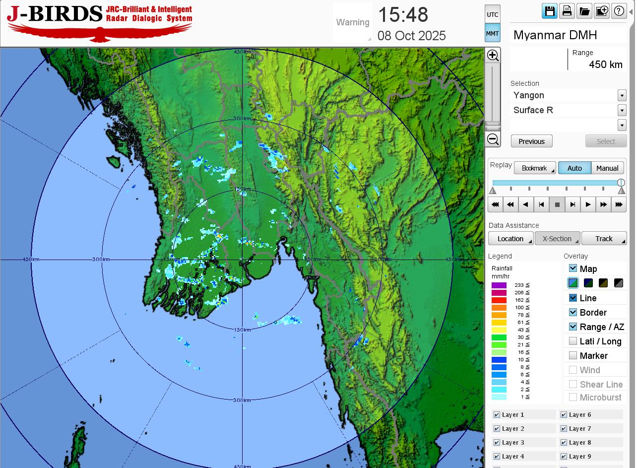 မိုးတိမ်တောင်ဖြစ်ပေါ်မှုအခြေအနေ။ ရန်ကုန်တိုင်းဒေသကြီး၊ မန္တလေးတိုင်းဒေသကြီး၊ ပဲခူးတိုင်းဒေသကြီး၊ စစ်ကိုင်းတိုင်းဒေသကြီးအထက်ပိုင်း၊ ဧရာဝတီတိုင်းဒေသကြီး၊ တနင်္သာရီတိုင်းဒေသကြီး၊ ကချင်ပြည်နယ်၊ ရခိုင်ပြည်နယ် နှင့် ရှမ်းပြည်နယ်(တောင်ပိုင်းနှင့် အရှေ့ပိုင်း)တို့တွင် မိုးတိမ်တောင်များ ဖြစ်ထွန်းမှုအားကောင်းလျက်ရှိပြီး အဆိုပါ မိုးတိမ်တောင်များရွေ့လျားရာနေရာတစ်လျှောက်တွင် မိုးရွာသွန်းခြင်းနှင့်အတူ လေပြင်းတိုက်ခတ်ခြင်း၊ မိုးထစ်ချုန်းခြင်း၊ မိုးကြိုးပစ်ခြင်း၊ လျှပ်စီးလက်ခြင်းနှင့် မိုးသီးကြွေခြင်းစသည့် မိုးလေဝသဖြစ်စဉ်များဖြစ်ပေါ်နိုင်ပါသဖြင့် ကြိုတင်သတိပြုနိုင်ပါရန် အကြံပြုအပ်ပါသည်။