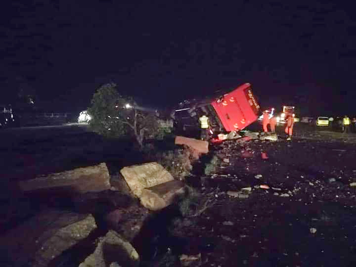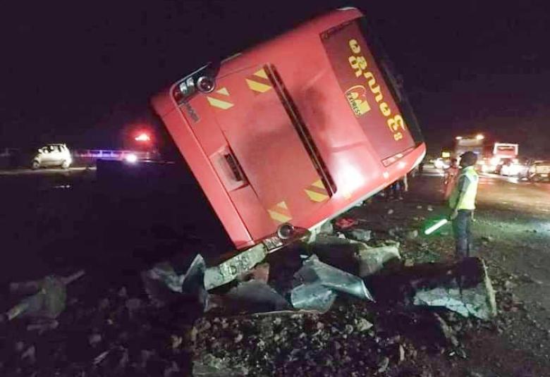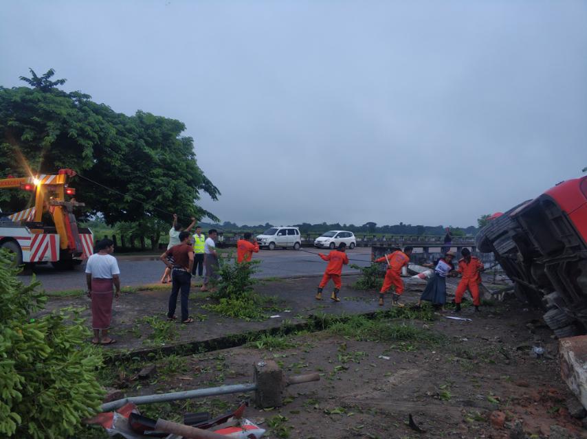 ရန်ကုန်မြောက်ပိုင်းခရိုင် လှည်းကူးမြို့နယ် နေပြည်တော်-ရန်ကုန်အမြန်လမ်းမကြီး မိုင်တိုင်အမှတ် (၁၃/၄)အနီးတွင် သြဂုတ် ၈ ရက် နံနက် ၃ နာရီခွဲခန့်က မန္တလာမင်းခရီးသည်ယာဉ် အရှိန်မထိန်းနိုင်ဘဲ တိမ်းမှောက်မှုဖြစ်ပွားခဲ့ကြောင်း သိရသည်။