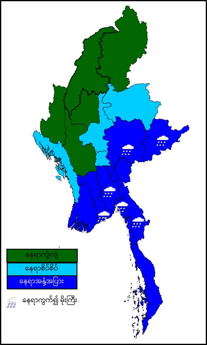 နောက် ၂ ရက်အတွက်ခန့်မှန်းချက်။ နေပြည်တော်၊ ရန်ကုန်တိုင်းဒေသကြီး၊ မန္တလေးတိုင်းဒေသကြီး၊ ပဲခူးတိုင်းဒေသကြီး၊ မကွေးတိုင်းဒေသကြီး၊ စစ်ကိုင်းတိုင်းဒေသကြီးအထက်ပိုင်း၊ ဧရာဝတီတိုင်းဒေသကြီး၊ တနင်္သာရီတိုင်းဒေသကြီး၊ ကချင်ပြည်နယ်၊ ကယားပြည်နယ်၊ ကရင်ပြည်နယ်၊ မွန်ပြည်နယ်နှင့် ရှမ်းပြည်နယ်တို့တွင် မိုးပိုလာမည်။