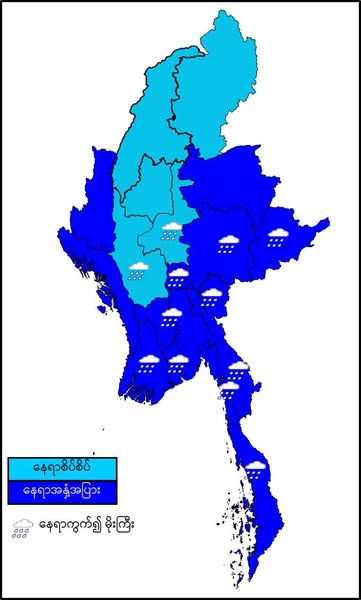 နောက် ၂ ရက်အတွက်ခန့်မှန်းချက်။ နေပြည်တော်၊ ရန်ကုန်တိုင်းဒေသကြီး၊ မန္တလေးတိုင်းဒေသကြီး၊ ပဲခူးတိုင်းဒေသကြီး၊ ဧရာဝတီတိုင်းဒေသကြီး၊ တနင်္သာရီတိုင်းဒေသကြီး၊ ကယားပြည်နယ်၊ ကရင်ပြည်နယ်၊ မွန်ပြည်နယ်၊ ရခိုင်ပြည်နယ်နှင့် ရှမ်းပြည်နယ်(တောင်ပိုင်းနှင့် အရှေ့ပိုင်း)တို့တွင် နေရာကွက်၍ မိုးကြီးမည်။