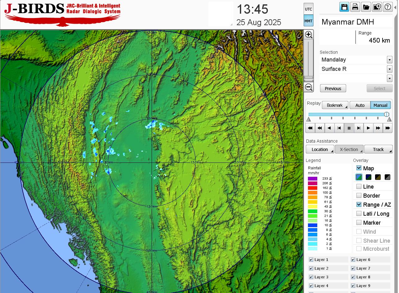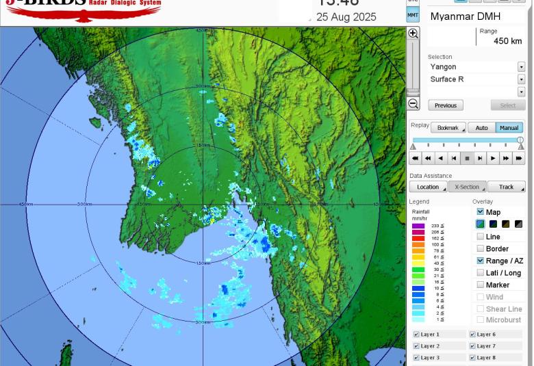 မိုးတိမ်တောင်ဖြစ်ပေါ်မှုအခြေအနေ။ ရန်ကုန်တိုင်းဒေသကြီး၊ တနင်္သာရီတိုင်းဒေသကြီး၊ ကရင်ပြည်နယ်နှင့် မွန်ပြည်နယ်တို့တွင် မိုးတိမ်တောင်များဖြစ်ထွန်းမှု အားကောင်းလျက်ရှိပြီး၊ အဆိုပါ မိုးတိမ်တောင်များ ရွေ့လျားရာ နေရာတစ်လျှောက်တွင် မိုးရွာသွန်းခြင်းနှင့်အတူ လေပြင်းတိုက်ခတ်ခြင်း၊ မိုးထစ်ချုန်းခြင်း၊ မိုးကြိုးပစ်ခြင်း၊ လျှပ်စီးလက်ခြင်းနှင့် မိုးသီးကြွေခြင်းစသည့် မိုးလေဝသဖြစ်စဉ်များ ဖြစ်ပေါ်နိုင်ပါသဖြင့် ကြိုတင်သတိပြုနိုင်ပါရန် အကြံပြုအပ်ပါသည်။
