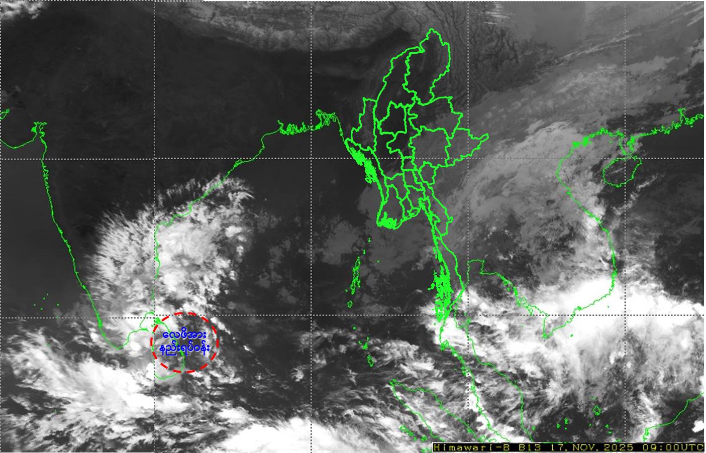 ဘင်္ဂလားပင်လယ်အော်အ‌ခြေအနေ။ ယနေ့မြန်မာစံတော်ချိန် ၁၅:၃၀ နာရီအချိန် တိုင်းထွာချက်များအရ ဘင်္ဂလားပင်လယ်အော် အနောက်တောင်ပိုင်းနှင့် ယင်းနှင့်ဆက်စပ်လျက်ရှိသော သီရိလင်္ကာနိုင်ငံကမ်းရိုးတန်းတွင် ဖြစ်ပေါ်နေသော လေဖိအားနည်းရပ်ဝန်း (Low Pressure Area) သည် ဆက်လက်တည်ရှိနေပါသည်။ အဆိုပါ လေဖိအားနည်းရပ်ဝန်းသည် နောက် ၂၄ နာရီအတွင်း အနောက်-အနောက်မြောက်ဘက်သို့ ဖြည်းညှင်းစွာ ရွေ့လျားနိုင်သည်ဟု ခန့်မှန်းရပါသည်။ ဘင်္ဂလားပင်လယ်အော် မြောက်ပိုင်းနှင့် အရှေ့အလယ်ပိုင်းတို့တွင် တိမ်အနည်းငယ် ဖြစ်ထွန်းနေပြီး၊ ကပ္ပလီပင်လယ်ပြင်နှင့် ကျန်ဘင်္ဂလားပင်လယ်အော်တို့တွင် တိမ်အသင့်အတင့်မှ တိမ်ထူထပ်နေပါသည်။