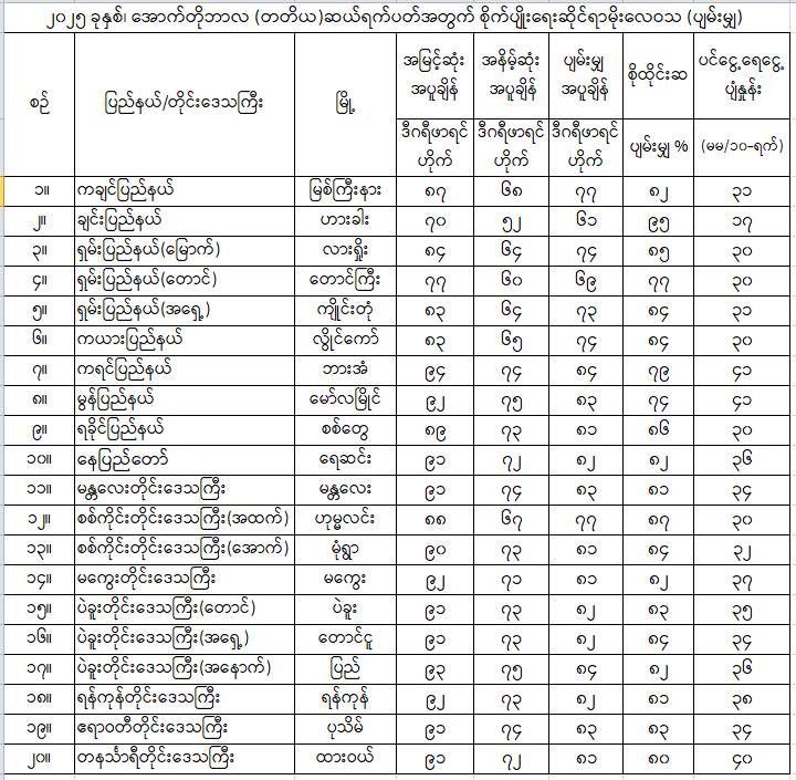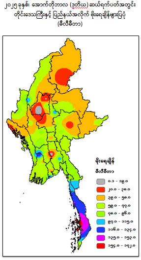 မြေဆီလွှာအောင်းရေအခြေအနေ----၂၀၂၅ ခုနှစ်၊ အောက်တိုဘာလ (ဒုတိယ)ဆယ်ရက်ပတ်အတွင်း (မြေဆီလွှာစိုစွတ်မှု) အခြေအနေများမှာ- ပဲခူးတိုင်းဒေသကြီးအရှေ့ပိုင်း၊ စစ်ကိုင်းတိုင်းဒေသကြီးအောက်ပိုင်းနှင့် ရခိုင်ပြည်နယ်တို့တွင် (စိုစွတ်)အခြေအနေနှင့် နေပြည်တော်၊ ရန်ကုန်တိုင်းဒေသကြီး၊ မန္တလေးတိုင်းဒေသကြီး၊ ပဲခူးတိုင်းဒေသကြီး(အနောက်ပိုင်းနှင့်တောင်ပိုင်း)၊ မကွေးတိုင်းဒေသကြီး၊ စစ်ကိုင်းတိုင်းဒေသကြီးအထက်ပိုင်း၊ ဧရာဝတီတိုင်းဒေသကြီး၊ တနင်္သာရီတိုင်းဒေသကြီး၊ ကချင်ပြည်နယ်၊ ကယားပြည်နယ်၊ ကရင်ပြည်နယ်၊ ချင်းပြည်နယ်၊ မွန်ပြည်နယ်နှင့် ရှမ်းပြည်နယ်တို့တွင် (ပြည့်ဝ)အခြေအနေ အသီးသီးရှိခဲ့ပါသည်။