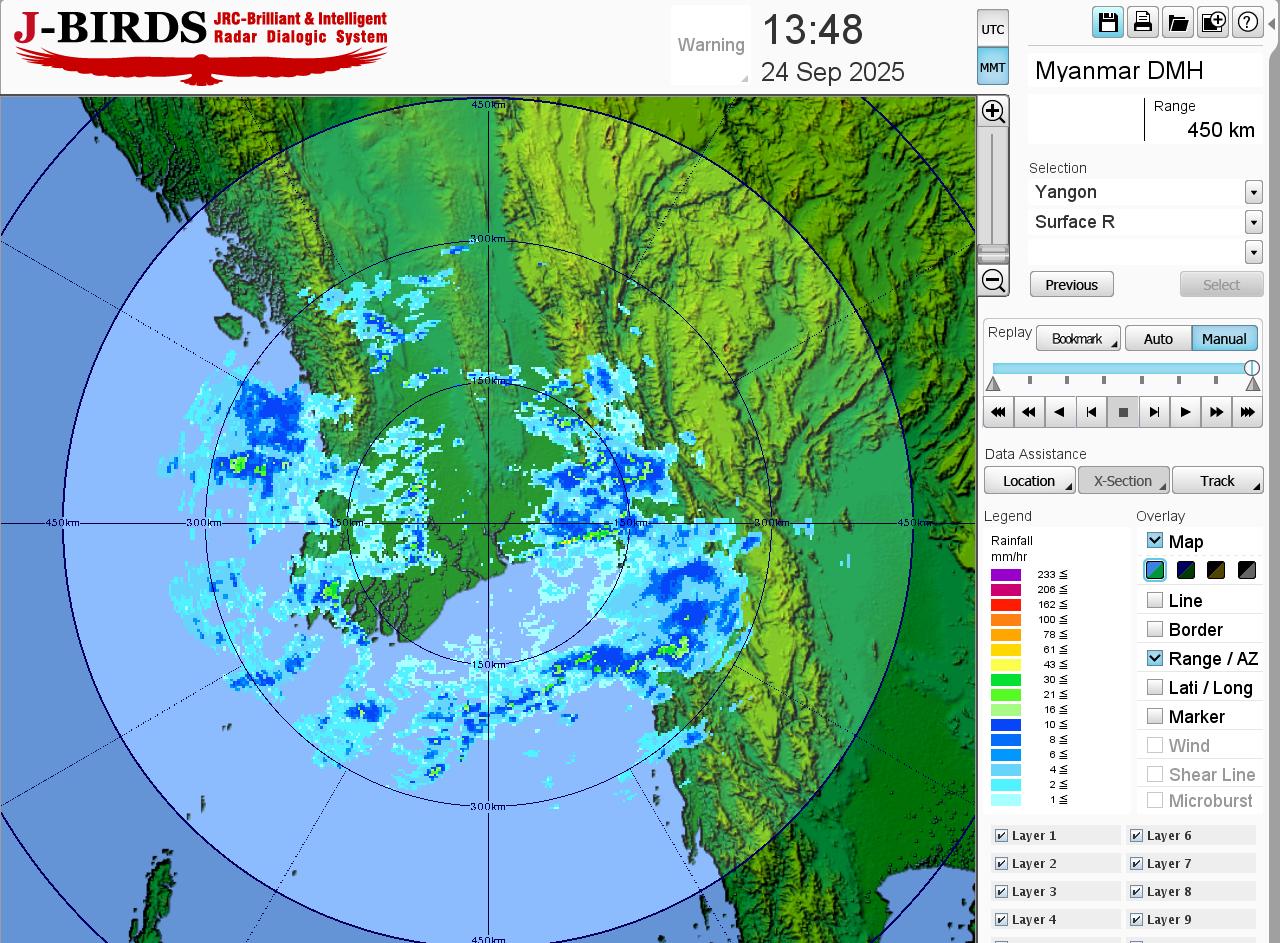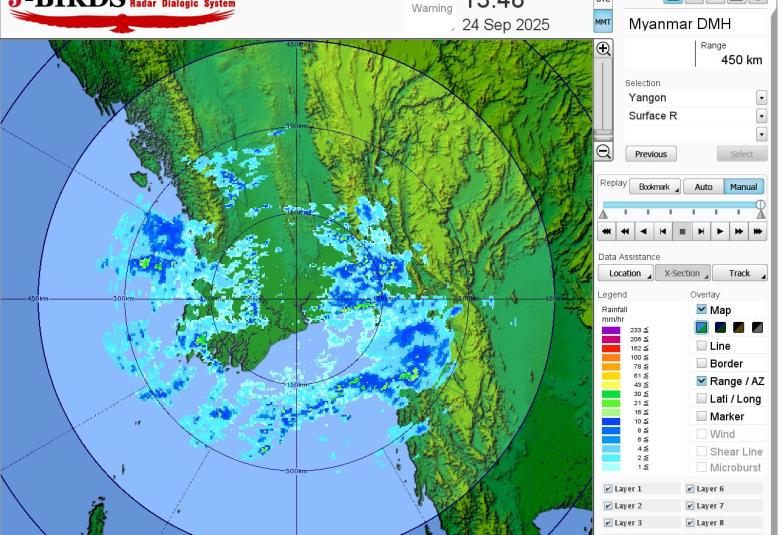 မိုးတိမ်တောင်ဖြစ်ပေါ်မှုအခြေအနေ။ ရန်ကုန်တိုင်းဒေသကြီး၊ ပဲခူးတိုင်းဒေသကြီး၊ မကွေးတိုင်းဒေသကြီး၊ စစ်ကိုင်းတိုင်းဒေသကြီးအထက်ပိုင်း၊ ဧရာဝတီတိုင်းဒေသကြီး၊ တနင်္သာရီတိုင်းဒေသကြီး၊ ကချင်ပြည်နယ်၊ မွန်ပြည်နယ်၊ ရခိုင်ပြည်နယ်နှင့် ရှမ်းပြည်နယ်(တောင်ပိုင်း)တို့တွင် မိုးတိမ်တောင်များ ဖြစ်ထွန်းမှုအားကောင်းလျက်ရှိပြီး အဆိုပါ မိုးတိမ်တောင်များရွေ့လျားရာ နေရာတစ်လျှောက်တွင် မိုးရွာသွန်းခြင်းနှင့်အတူလေပြင်း တိုက်ခတ်ခြင်း၊ မိုးထစ်ချုန်းခြင်း၊ မိုးကြိုးပစ်ခြင်း၊ လျှပ်စီးလက်ခြင်းနှင့် မိုးသီးကြွေခြင်းစသည့် မိုးလေဝသဖြစ်စဉ်များ ဖြစ်ပေါ်နိုင်ပါသဖြင့် ကြိုတင်သတိပြုနိုင်ပါရန် အကြံပြုအပ်ပါသည်။