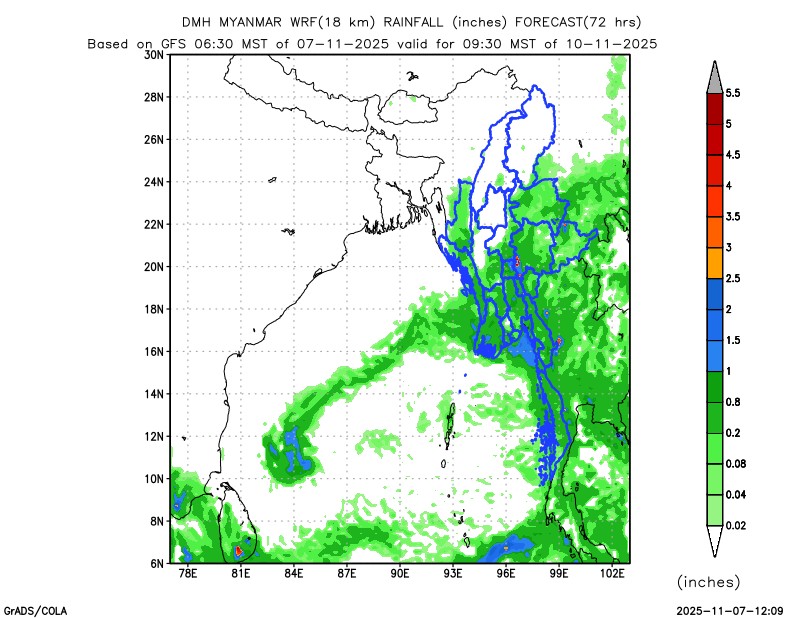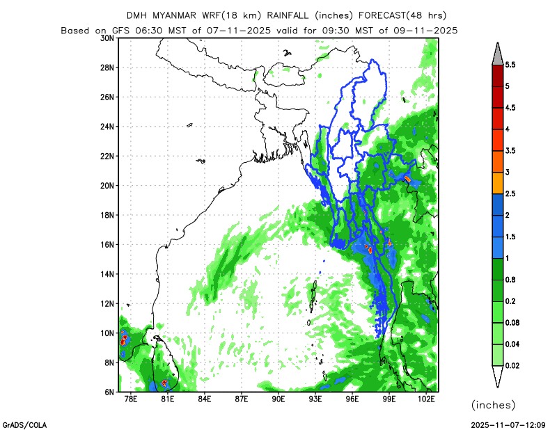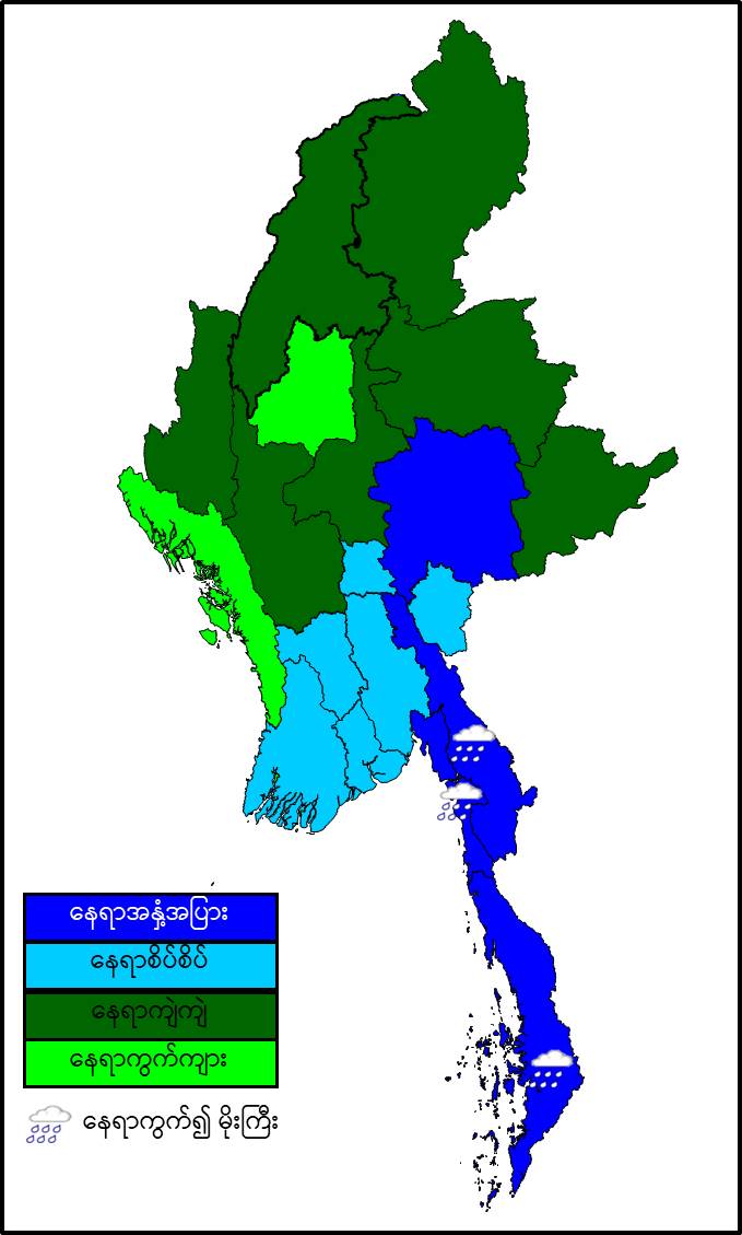 နောက် ၂ ရက်အတွက်ခန့်မှန်းချက်။ နေပြည်တော်၊ ရန်ကုန်တိုင်းဒေသကြီး၊ ပဲခူးတိုင်းဒေသကြီး၊ ဧရာဝတီတိုင်းဒေသကြီး၊ တနင်္သာရီတိုင်းဒေသကြီး၊ ကယားပြည်နယ်၊ ကရင်ပြည်နယ်၊ မွန်ပြည်နယ်၊ ရခိုင်ပြည်နယ်နှင့် ရှမ်းပြည်နယ်တို့တွင် နေရာစိပ်စိပ်မှ နေရာအနှံ့အပြား မိုးထစ်ချုန်းရွာမည်။