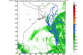 မနက်ဖြန်နံနက်အထိခန့်မှန်းချက်။ စစ်ကိုင်းတိုင်းဒေသကြီးအောက်ပိုင်းနှင့် ရခိုင်ပြည်နယ်တို့တွင် နေရာကွက်ကျား၊ မန္တလေးတိုင်းဒေသကြီး၊ မကွေးတိုင်းဒေသကြီး၊ စစ်ကိုင်းတိုင်းဒေသကြီးအထက်ပိုင်း၊ ကချင်ပြည်နယ်၊ ချင်းပြည်နယ်နှင့် ရှမ်းပြည်နယ်(မြောက်ပိုင်းနှင့် အရှေ့ပိုင်း)တို့တွင် နေရာကျဲကျဲ၊ နေပြည်တော်၊ ရန်ကုန်တိုင်းဒေသကြီး၊ ပဲခူးတိုင်းဒေသကြီး၊ ဧရာဝတီတိုင်းဒေသကြီးနှင့် ကယားပြည်နယ်တို့တွင် နေရာစိပ်စိပ်နှင့် ကျန်တိုင်းဒေသကြီးနှင့် ပြည်နယ်တို့တွင် နေရာအနှံ့အပြား မိုးထစ်ချုန်းရွာပြီး တနင်္သာရီတိုင်းဒေသကြီး၊ ကရင်ပြည်နယ်နှင့် မွန်ပြည်နယ်တို့တွင် နေရာကွက်၍ မိုးကြီးနိုင်ပါသည်။ ရွာရန်ရာနှုန်းပြည့် ဖြစ်ပါသည်။
