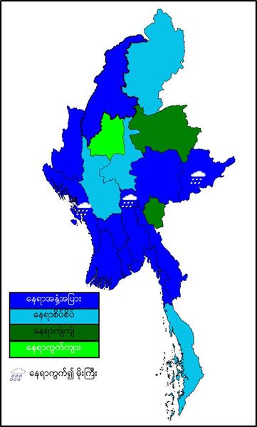 မနက်ဖြန်နံနက်အထိခန့်မှန်းချက်။ စစ်ကိုင်းတိုင်းဒေသကြီးအောက်ပိုင်းတွင် နေရာကွက်ကျား၊ ရှမ်းပြည်နယ် (မြောက်ပိုင်း) နှင့် ကယားပြည်နယ်တို့တွင် နေရာကျဲကျဲ၊ မန္တလေးတိုင်းဒေသကြီး၊ မကွေးတိုင်းဒေသကြီး၊ တနင်္သာရီတိုင်းဒေသကြီးနှင့် ကချင်ပြည်နယ်တို့တွင် နေရာစိပ်စိပ်နှင့် ကျန်တိုင်းဒေသကြီးနှင့် ပြည်နယ်တို့တွင် နေရာအနှံ့အပြား မိုးထစ်ချုန်းရွာပြီး၊ နေပြည်တော်၊ ရှမ်းပြည်နယ် (အရှေ့ပိုင်း) နှင့် ရခိုင်ပြည်နယ်တို့တွင် နေရာကွက်၍ မိုးကြီးနိုင်ပါသည်။ ရွာရန်ရာနှုန်းပြည့် ဖြစ်ပါသည်။