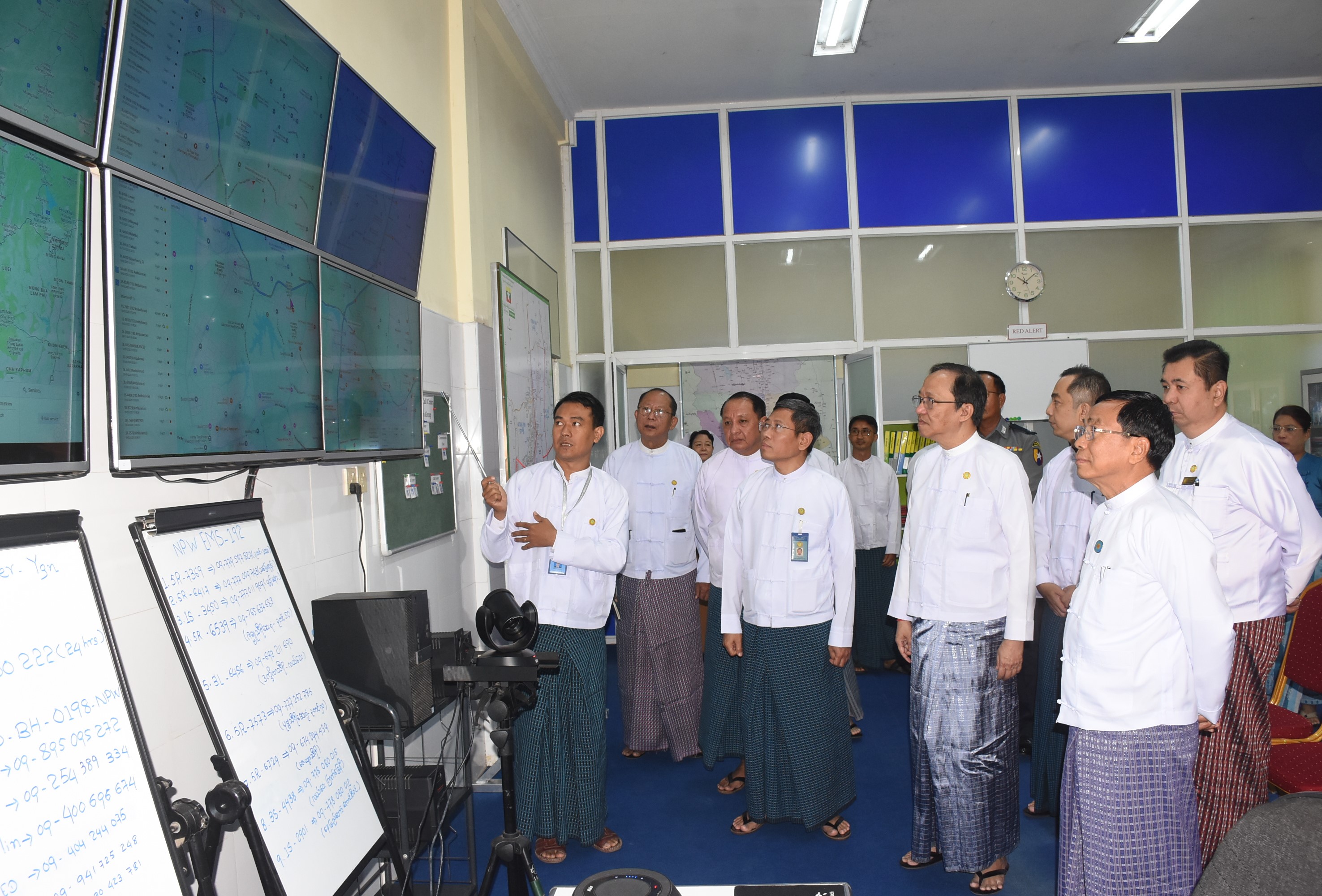 ဆက်လက်၍ ပြည်ထောင်စုဝန်ကြီး၊ နေပြည်တော်ကောင်စီဥက္ကဋ္ဌနှင့် တာဝန်ရှိသူများသည် နေပြည်တော်ပြည်သူ့ဆေးရုံကြီး(ခုတင်-၁၀၀၀)တွင် ဖွင့်လှစ်ထားရှိသည့် “EMS 192 Command and Control Center” သို့ သွားရောက်၍ လုပ်ငန်းဆောင်ရွက်မှုများကို ကြည့်ရှုကာ လူနာတင်ယာဉ် များဖြင့် လူနာများ ကယ်ဆယ်ပို့ဆောင်ရေးလုပ်ငန်းများ ဆောင်ရွက်မှု သရုပ်ပြခြင်းများကို ကြည့်ရှုအားပေးခြင်း၊ လူနာတင်ယာဉ် ပြင်ဆင်ထားရှိမှုများနှင့် Ambulances Crew စုဖွဲ့မှုများကို ကြည့်ရှုစစ်ဆေးကြသည်။