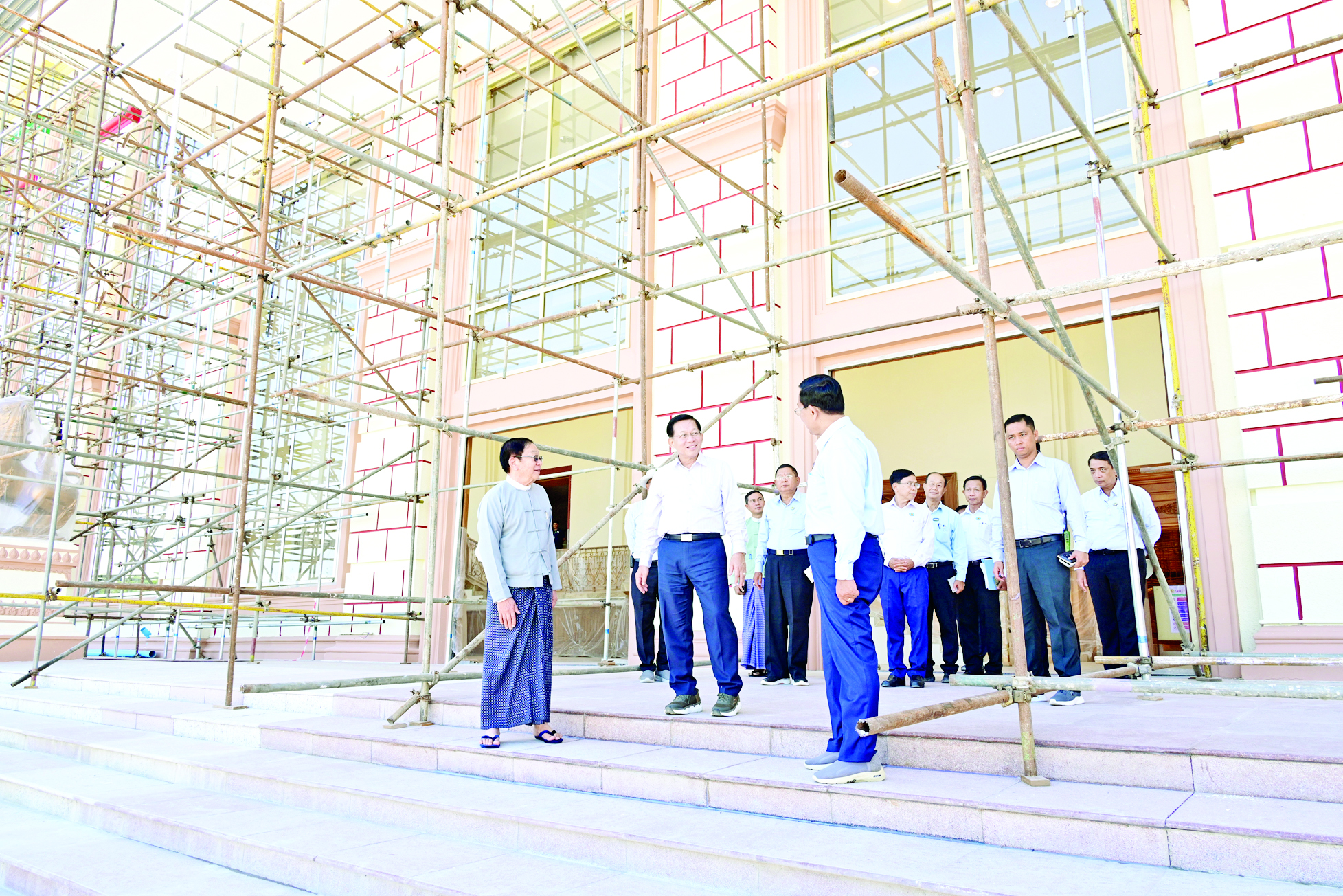 ထို့နောက် နိုင်ငံတော်ယာယီသမ္မတ နိုင်ငံတော်လုံခြုံရေးနှင့်အေးချမ်းသာယာရေးကော်မရှင်ဥက္ကဋ္ဌ နှင့်အဖွဲ့ဝင်များသည် ငလျင်ဘေးဒဏ်ကြောင့်ထိခိုက်ပျက်စီးမှုများဖြစ်ပေါ်ခဲ့သည့် လွှတ်တော်ဝန်းအတွင်းရှိအဆောက်အဦများအား ပြန်လည်ပြုပြင်တည်ဆောက်ပြီးစီးမှု အခြေအနေများကို သွားရောက်ကြည့်ရှုစစ်ဆေးသည်။